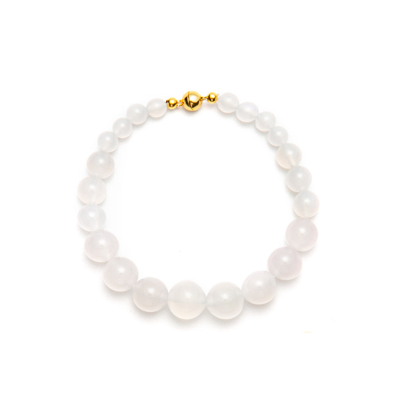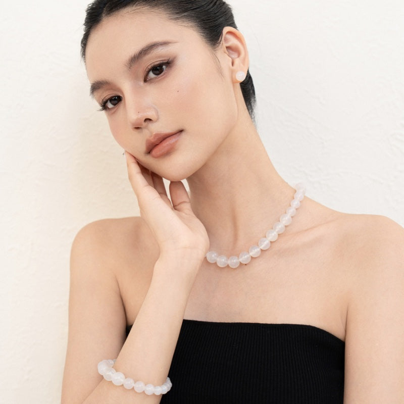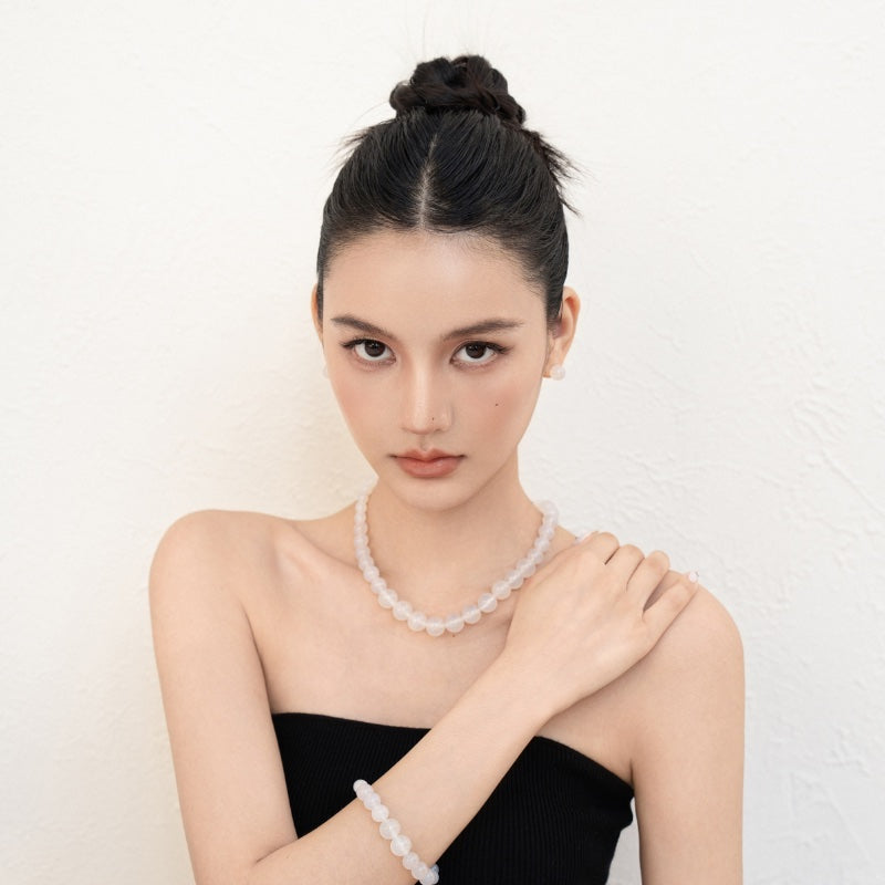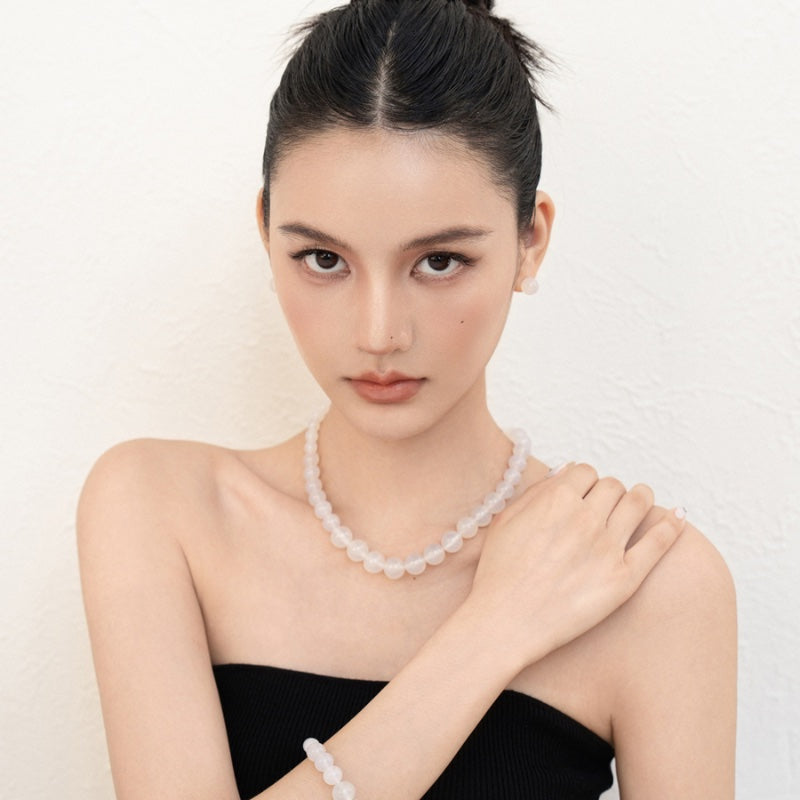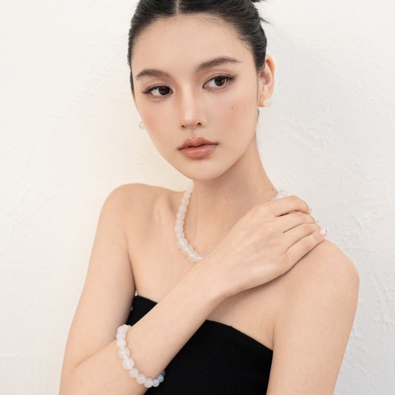 カラフルな天然石ビーズが並び、シンプルでありながら楽しいデザインを生み出す。メッキの艶やかな輝きが、天然石の個性的な色彩と輝きを引き立て、手元に存在感のあるアクセントを与える。角度によって変化するビーズの光沢が、日常の装いにも明るく華やかな雰囲気を演出し、「果凍串珠(ゼリービーズ)」シリーズのような、可憐で楽しい印象を表現する。
