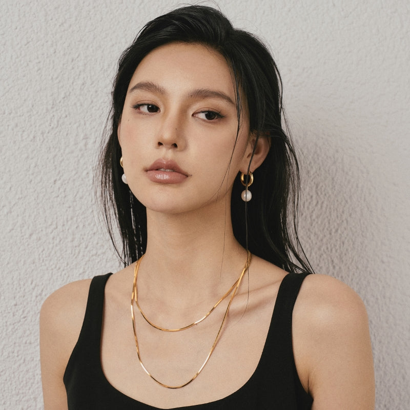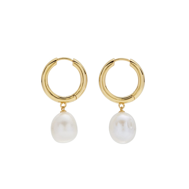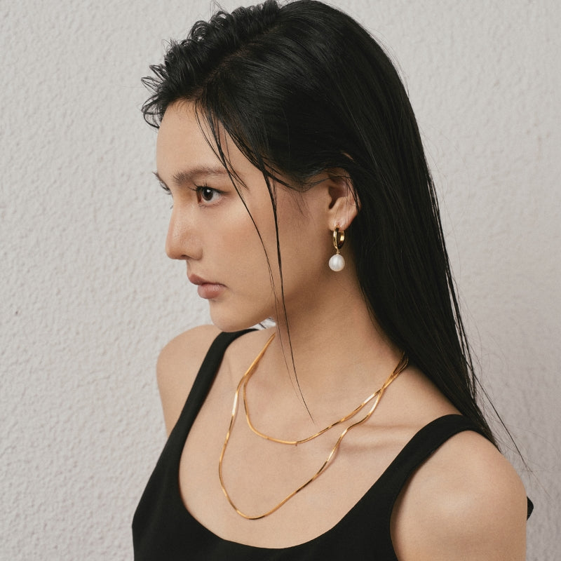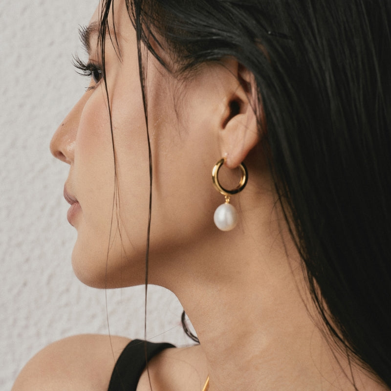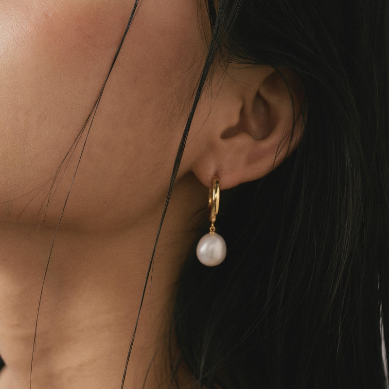 シンプルなホック型フレームに、不揃いな淡水真珠がぶら下がり、フレンチクラシックなデザインを体現。メッキのしっとりとした輝きが、真珠の柔らかい光沢を引き立て、耳元に上品でありながらリラックスした存在感を与える。角度によって揺れる真珠のラスターが、日常の装いにも優雅なアクセントを加え、ノスタルジーな雰囲気を演出する。