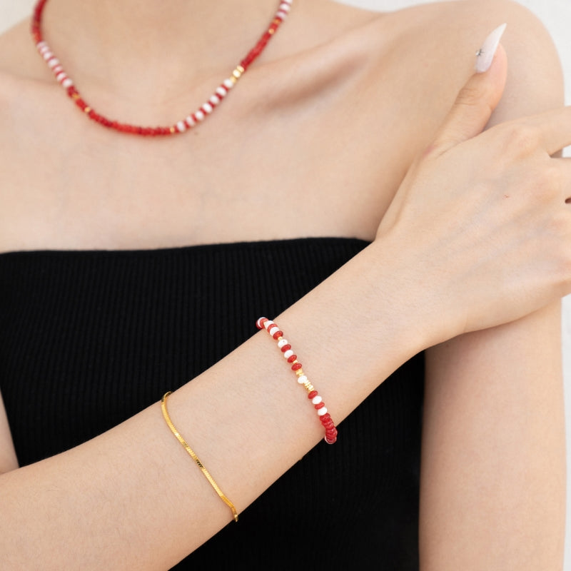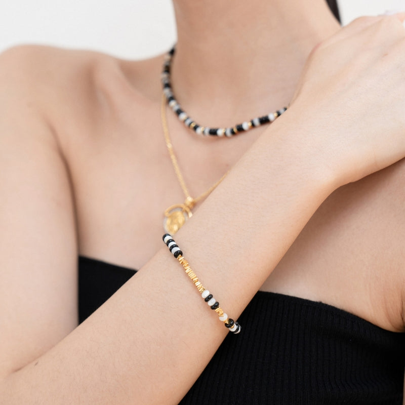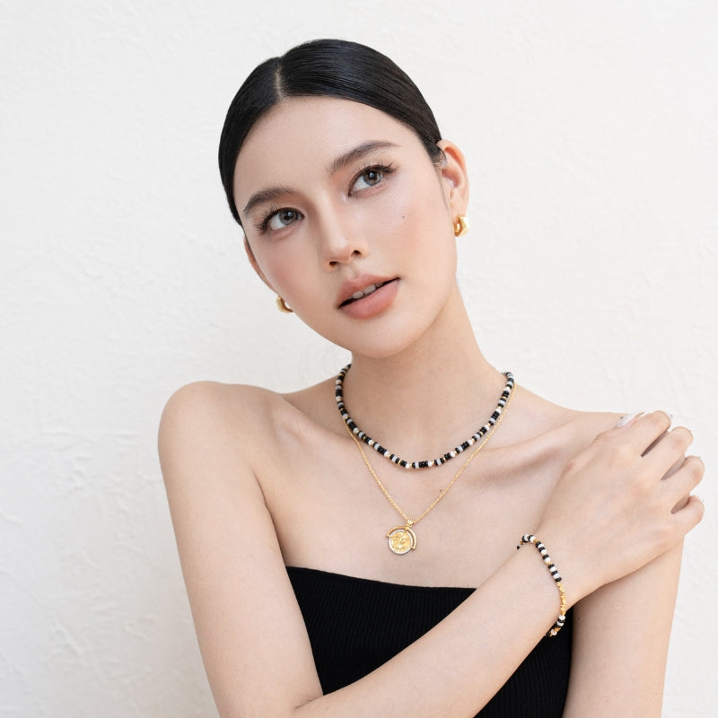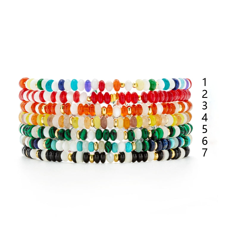 カラフルな天然石ビーズが連なり、レインボーカラーのデザインを生み出す。異素材の組み合わせが、手元に楽しくてポップな存在感を与え、角度によって変化する各ビーズの光沢が、日常の装いにも個性的なアクセントを加える。「彩虹串珠」シリーズらしい、明るく華やかな雰囲気を演出し、心弾みがける輝きを表現する。