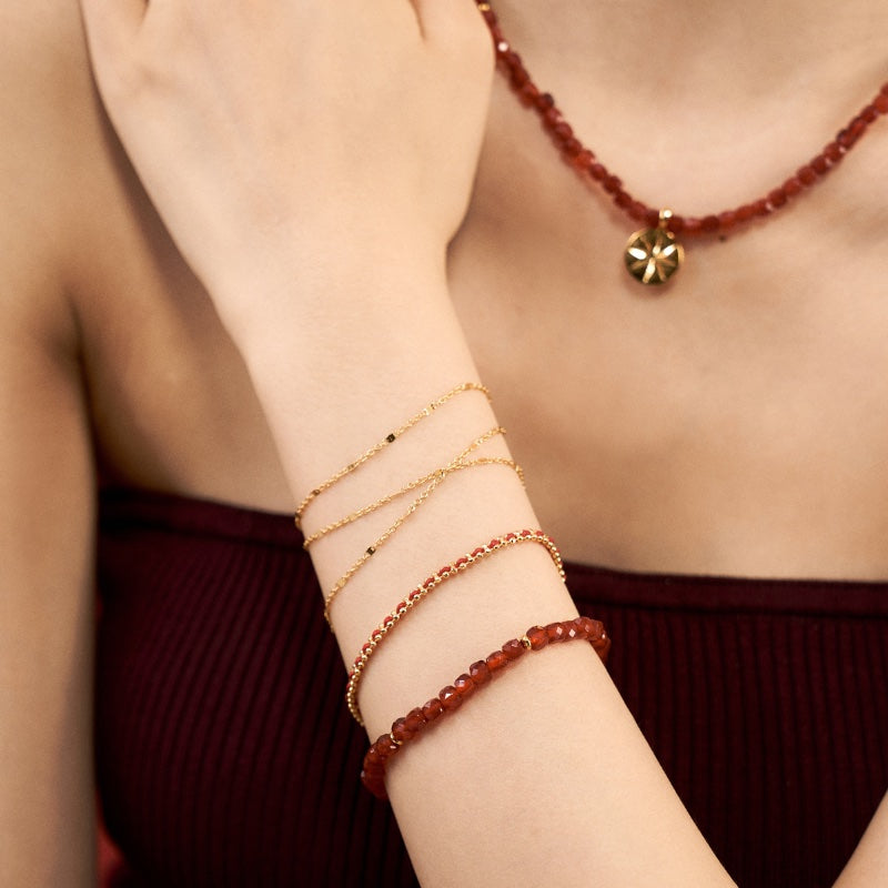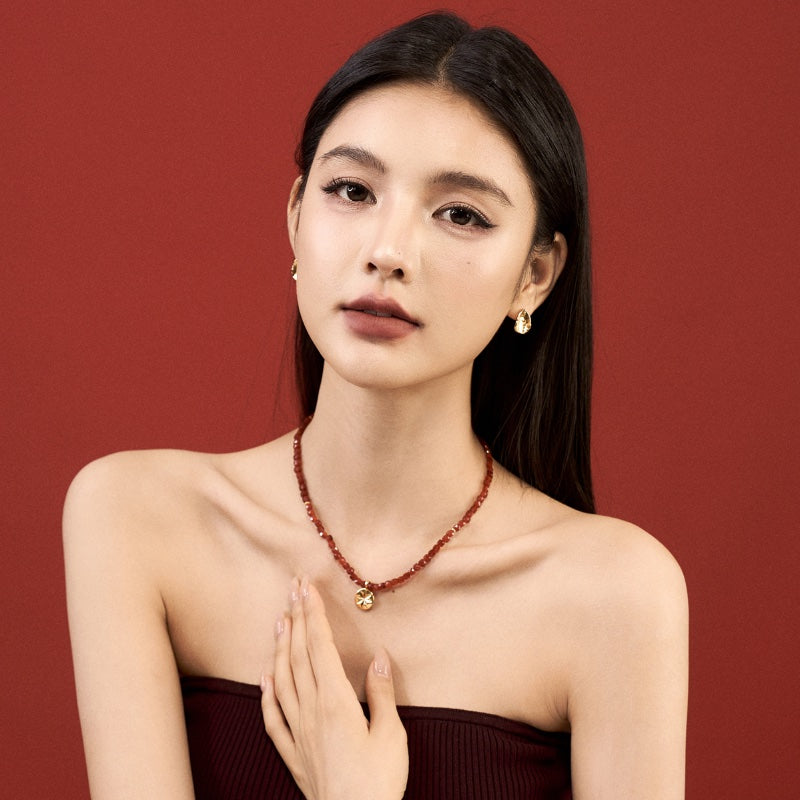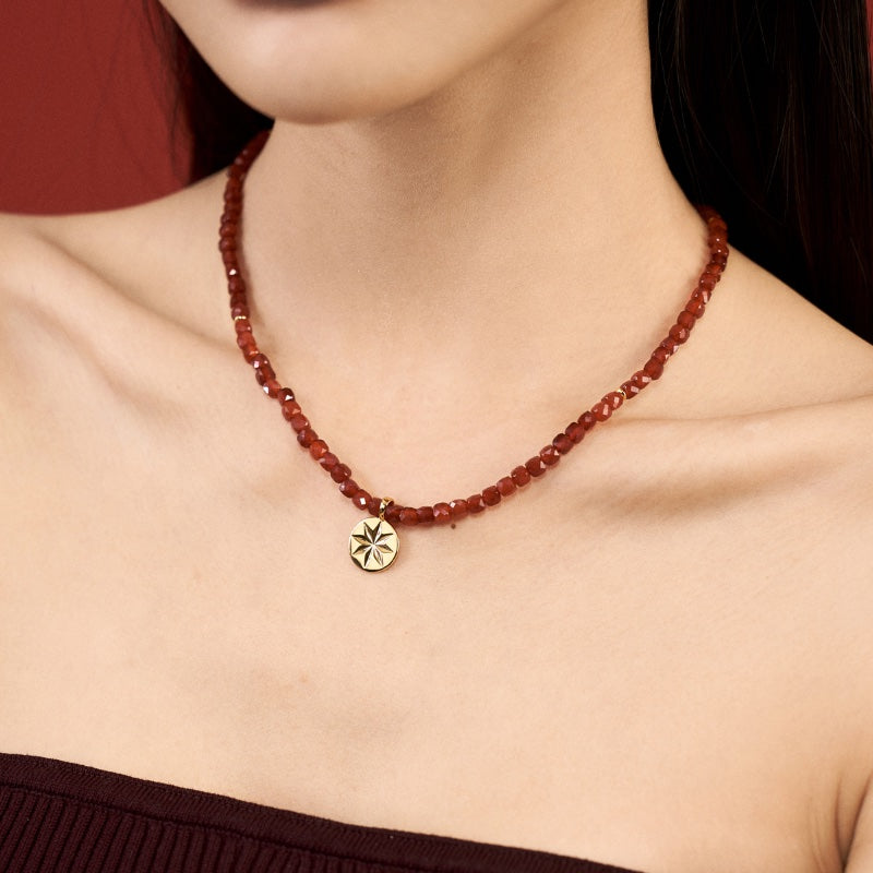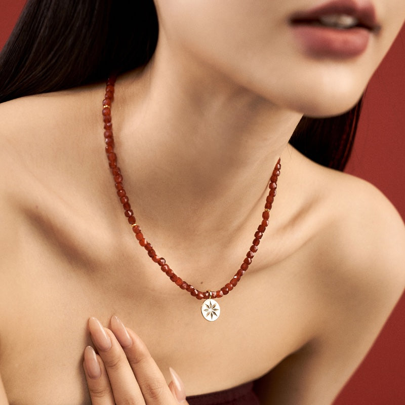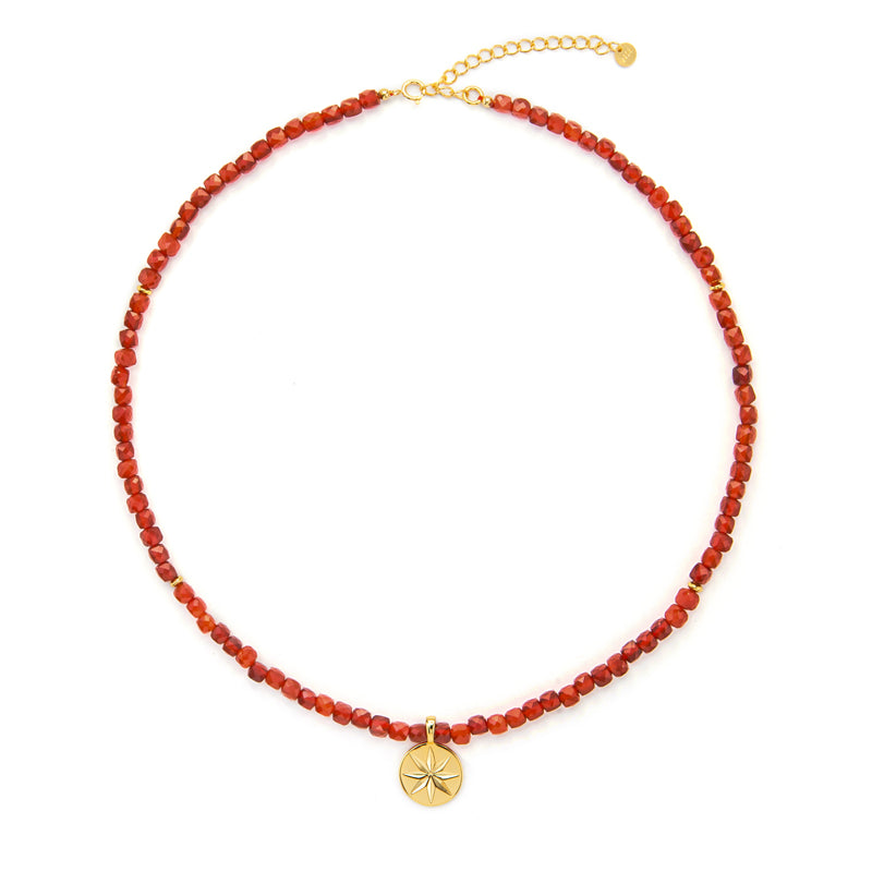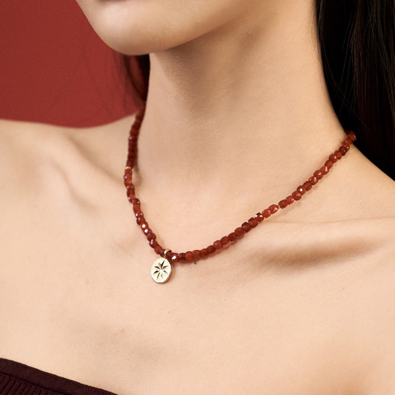 レッドビーズの連なりに、スター型のメッキペンダントがアクセントされ、ヴィンテージでありながらモダンなデザイン。力強いメッキの金色が、レッドビーズの鮮やかな色合いを引き立て、首元に存在感と洗練された輝きを添える。角度によって変化する光沢が、個性的な演出を叶える。