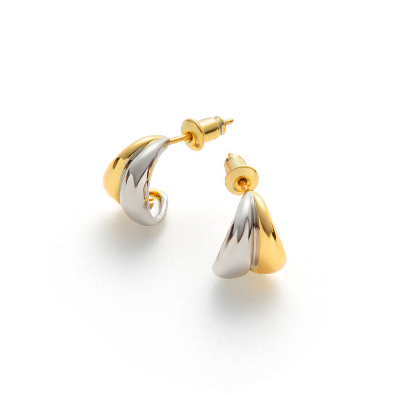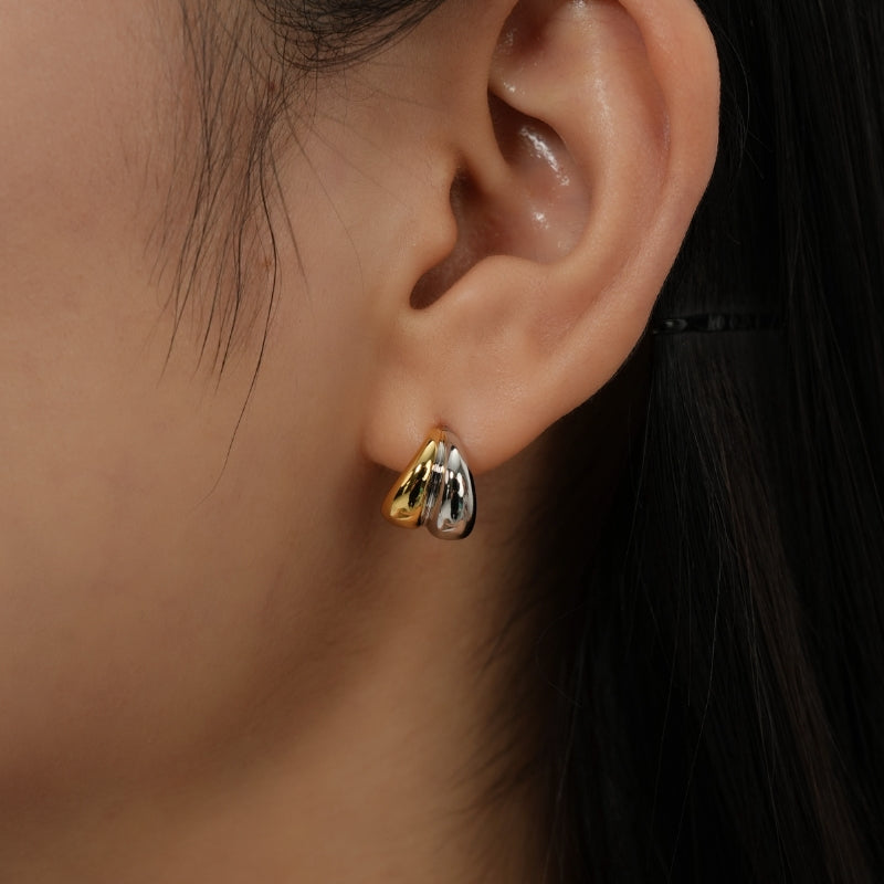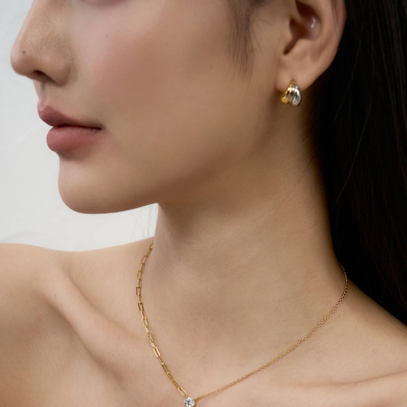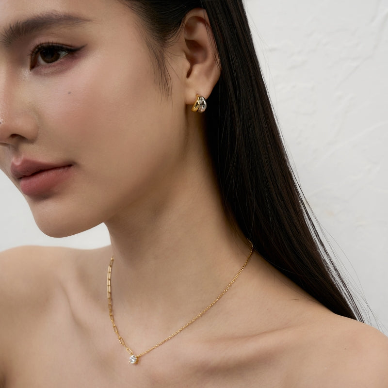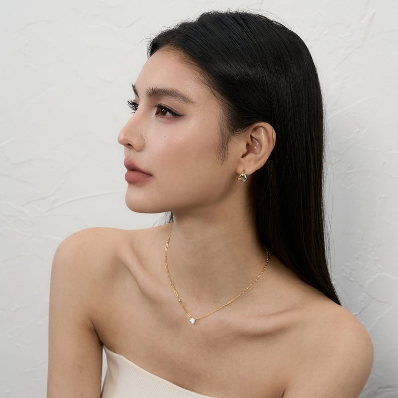 滑らかなカーブが重なり合い、立体的なデザインを紡ぐ。力強さとエレガンスを兼ね備えたフォルムが、顔周りに存在感と洗練された輝きを添える。角度によって異なる光沢を放ち、どの瞬間も印象的に演出する。