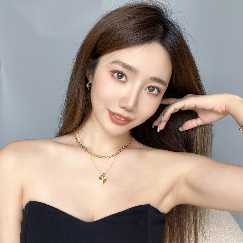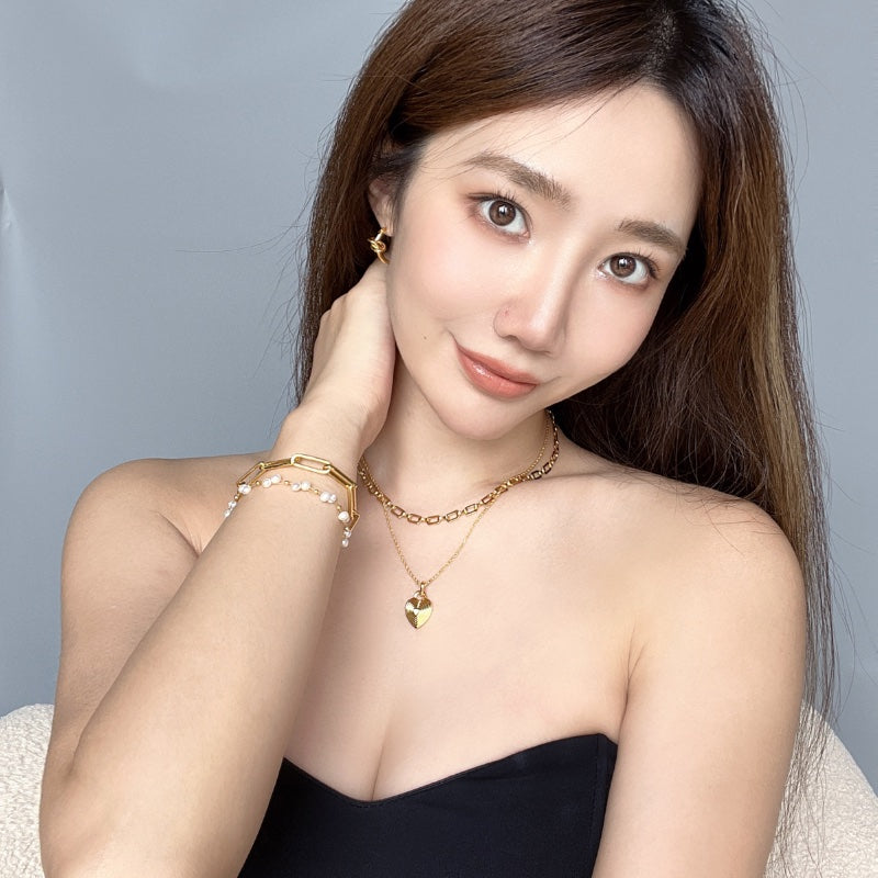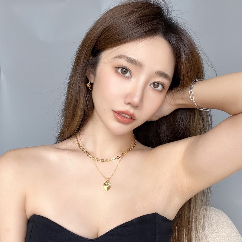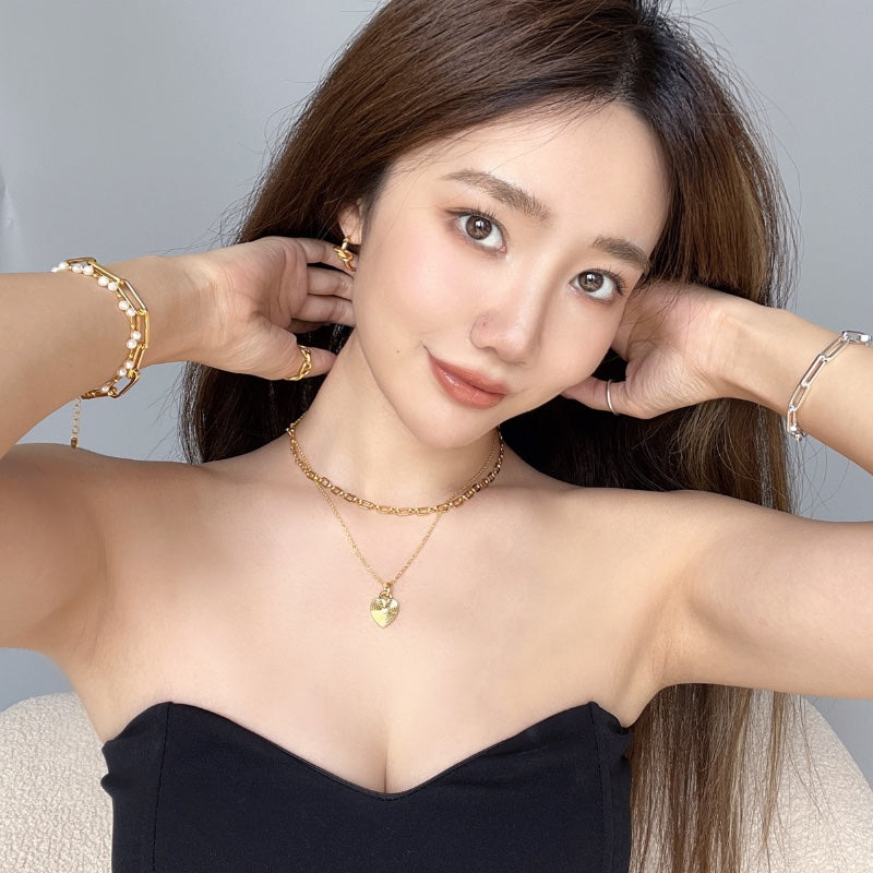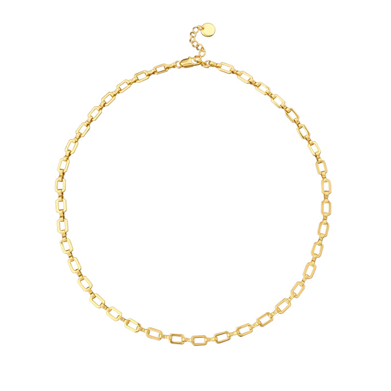 幾何学的なリンクチェーンが連なり、シンプルでありながら力強いデザインを生み出す。メッキの艶やかな輝きが、首元に存在感とともに、モダンで洗練された雰囲気を添える。角度によって変化する光沢が、日常の装いにもスタイリッシュなアクセントを加え、印象的な演出を叶える。