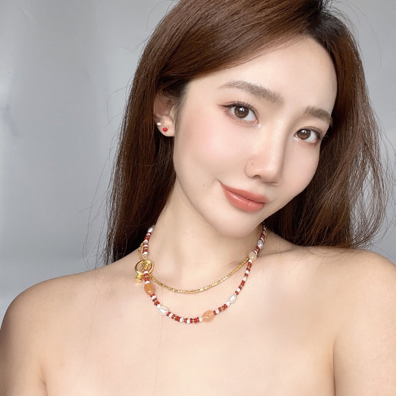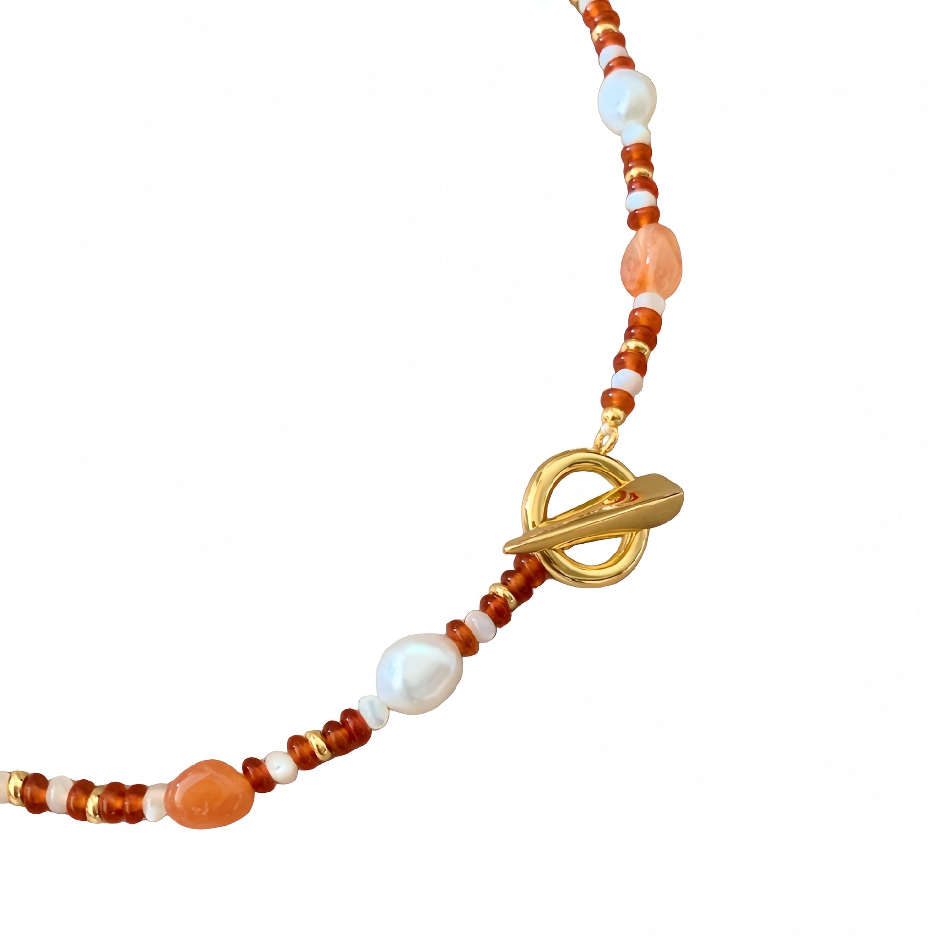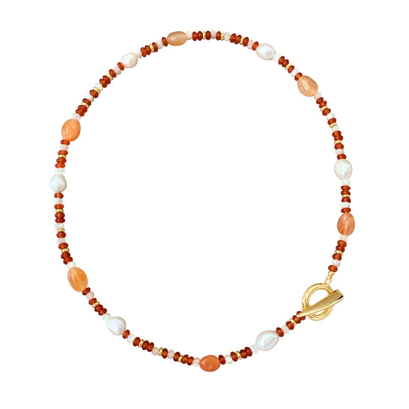 赤い瑪瑙、白いベムーア、ミラクルワックスのビーズが調和し、メッキのゴールドパーツがアクセントされた、温かみのあるデザイン。様々な石の質感と光沢が、首元に存在感と楽しい雰囲気を添える。角度によって変化する光沢が、ユニークな演出を叶え、自然派の魅力を存分に発揮する。