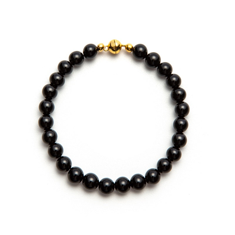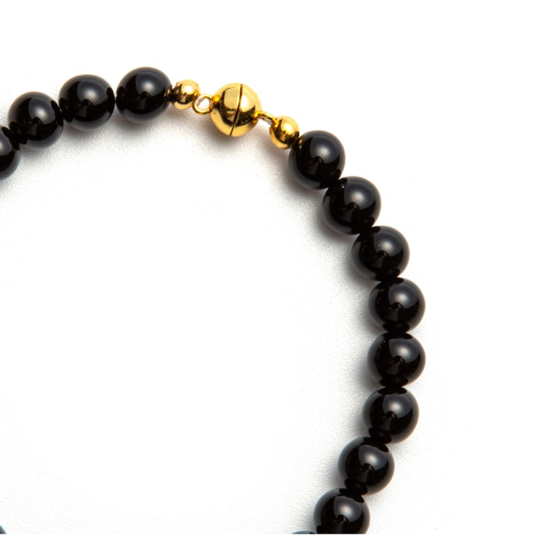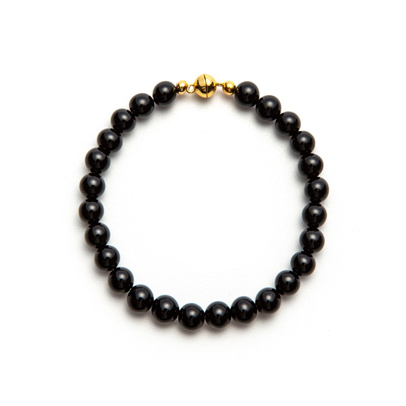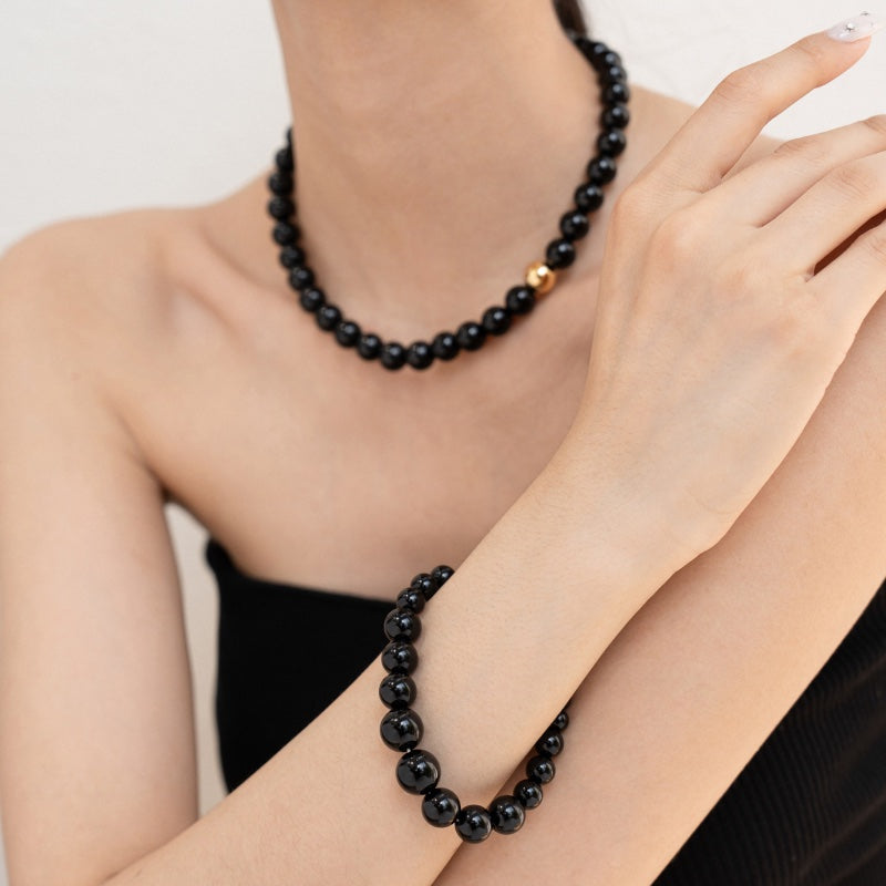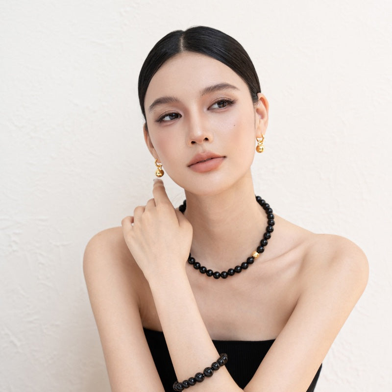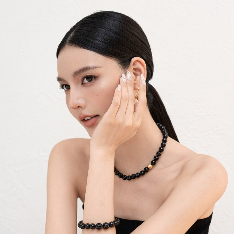黒瑪瑙のビーズが連なり、シンプルでありながら力強い「国風」デザインを体現。メッキの輝きが、黒瑪瑙の深みのある色合いを引き立て、手元に存在感とシックで洗練された雰囲気を添える。角度によって変化する光沢が、伝統のある雰囲気を演出し、どの瞬間も印象的に輝かせる。
