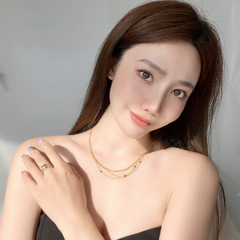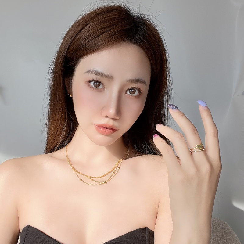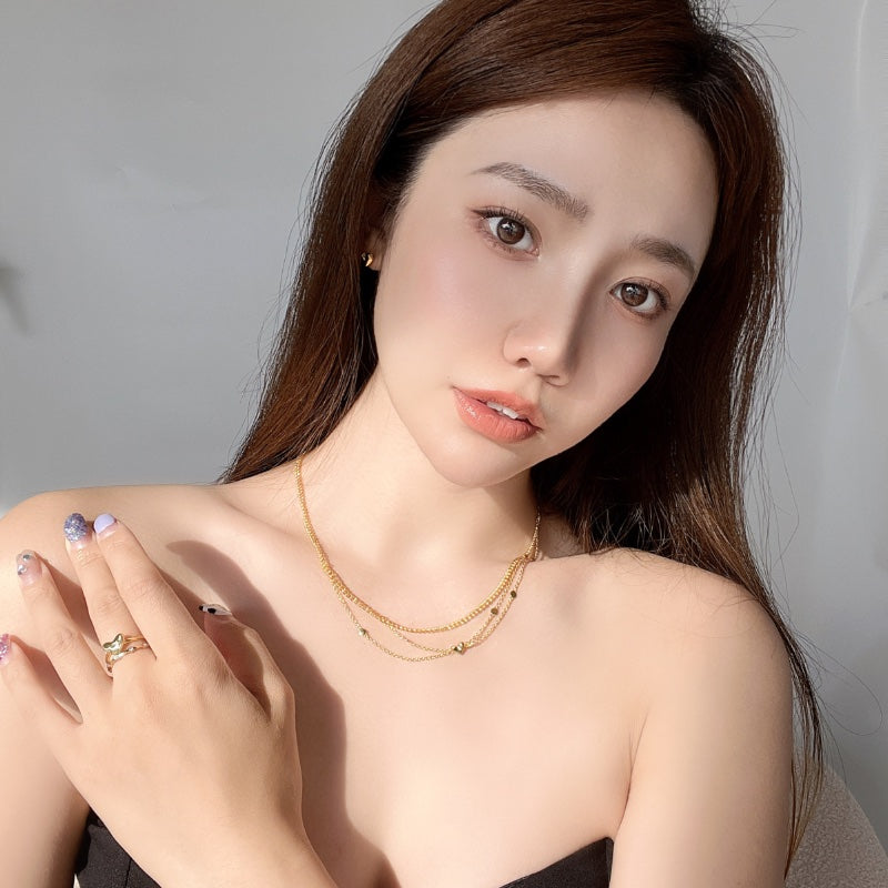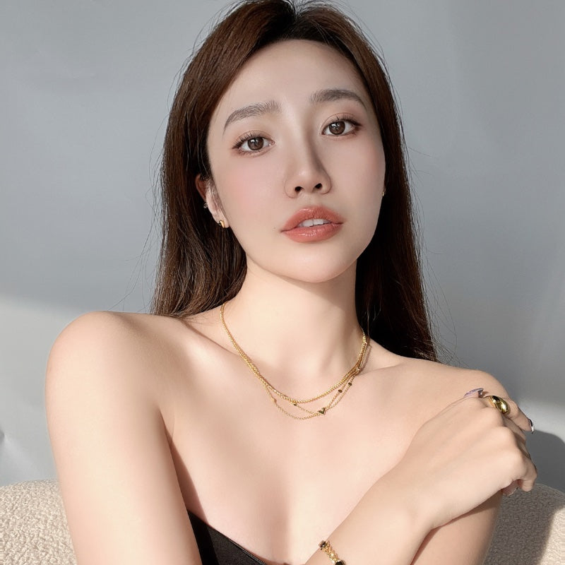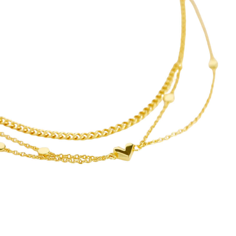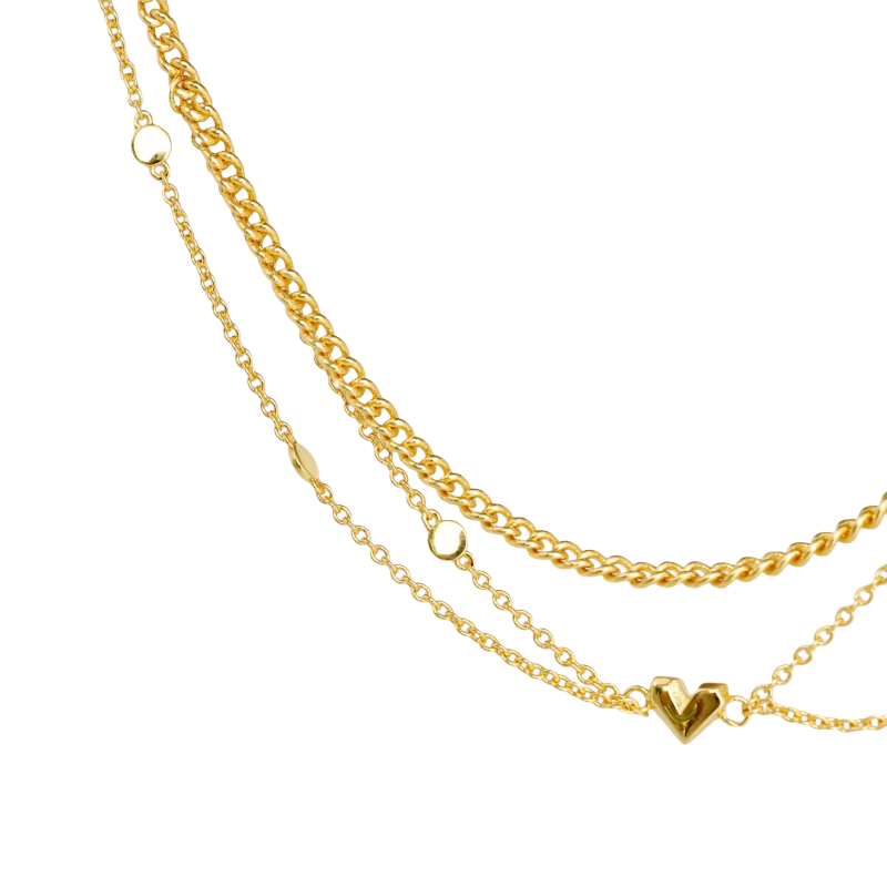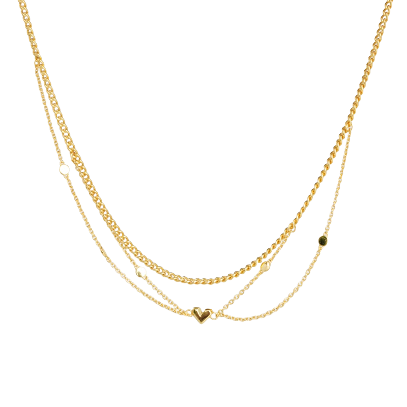 多層の異なるチェーンが重なり、ハートペンダントを中心にアクセントを配置したデザイン。力強いメッキの金色が、首元に存在感と洗練された輝きを添え、角度によって変化する光沢が、レイヤードな雰囲気を演出し、様々なシーンで印象的な輝きを叶える。