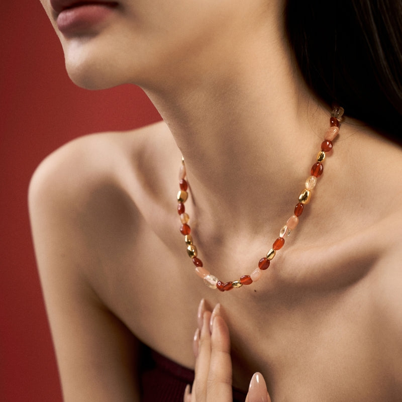 カラフルな天然石ビーズとメッキパーツが組み合わさり、シンプルでありながらポップなデザインを生み出す。メッキの輝きが、天然石の個性的な色彩と質感を引き立て、首元に楽しくて洗練された存在感を与える。角度によって変化する各ビーズの光沢が、日常の装いにもアクティブなアクセントを加え、「彩色串珠」シリーズのような、明るく華やかな雰囲気を演出する。