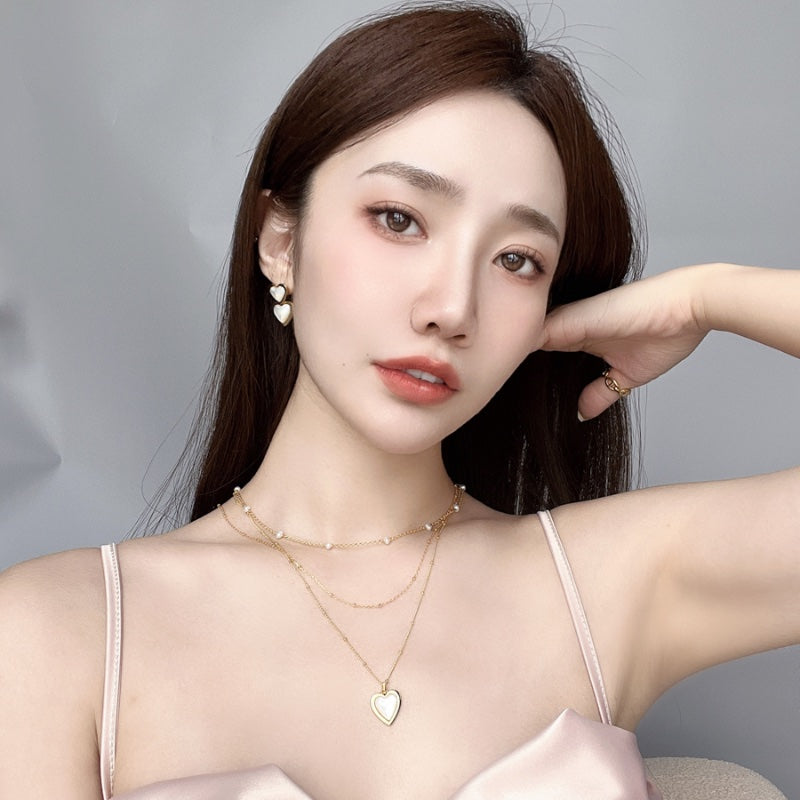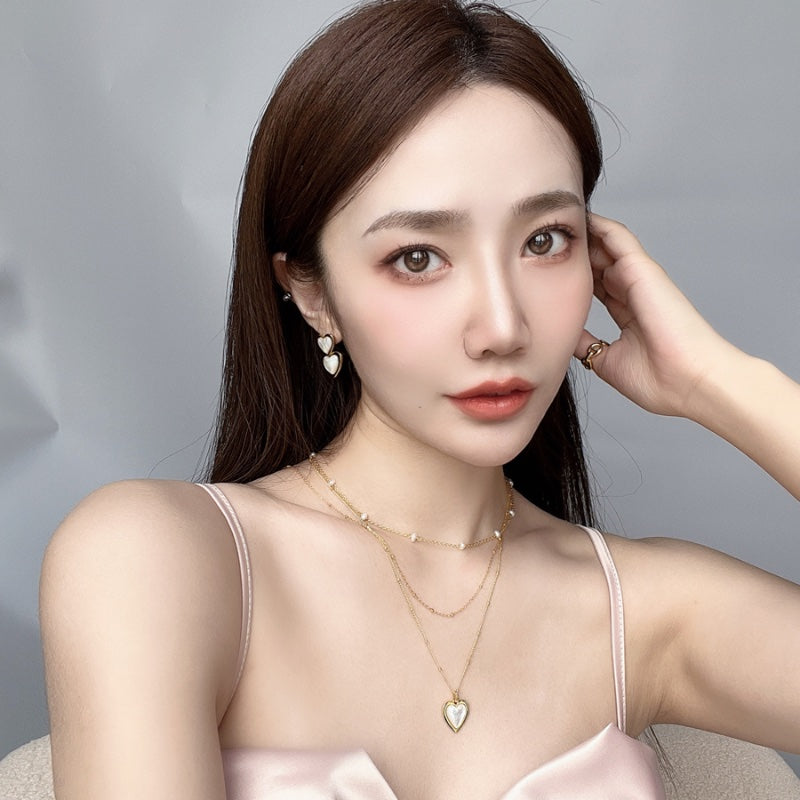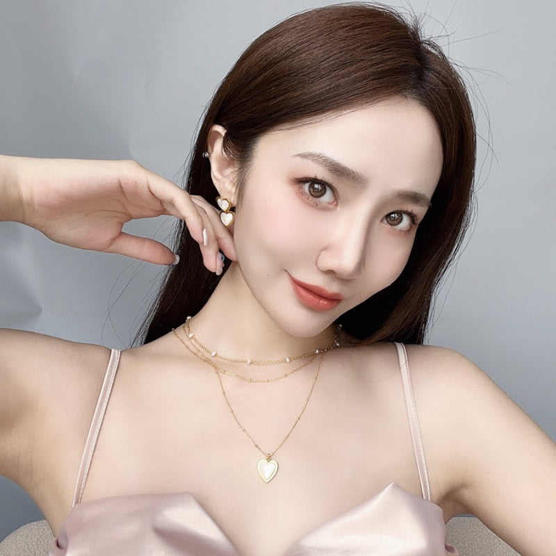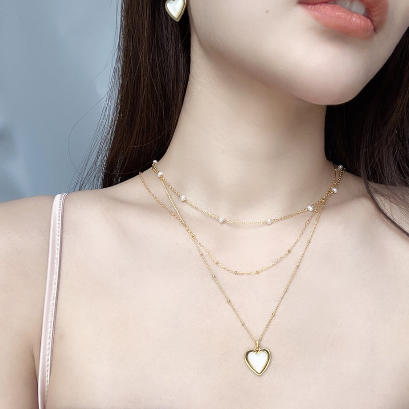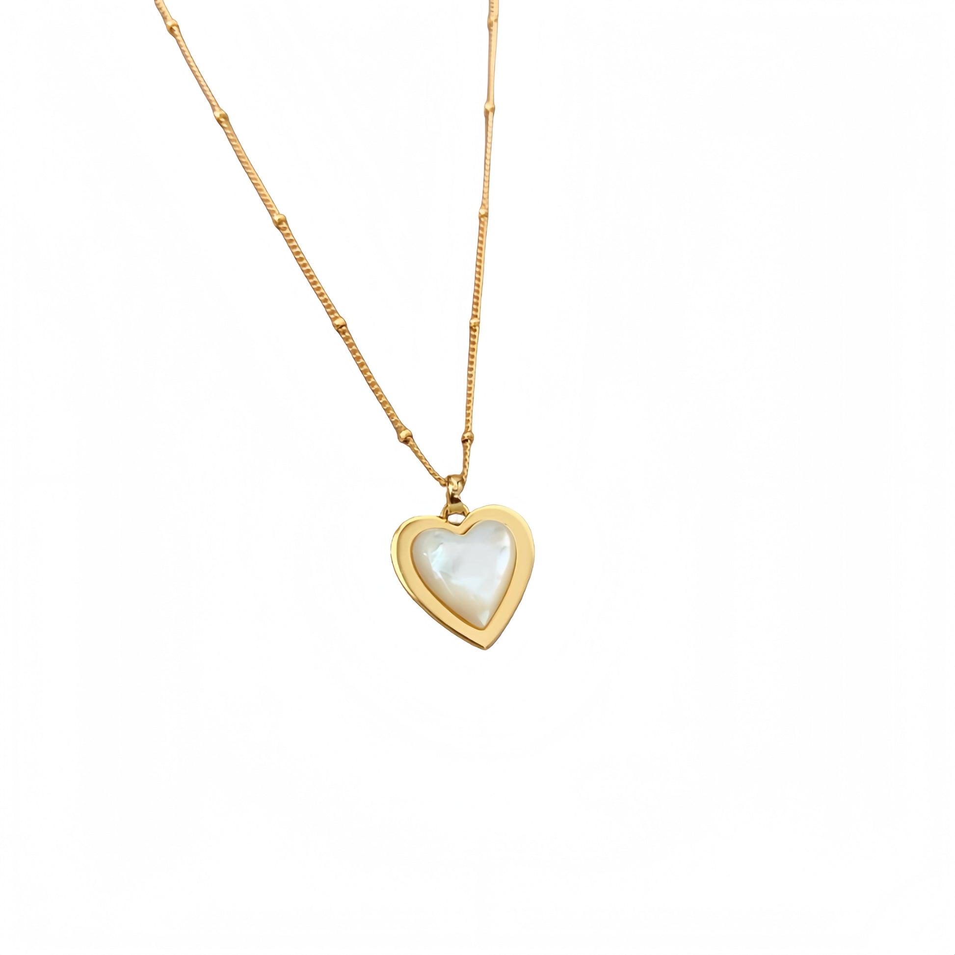 ハート型の天然白ベムーアが、メッキの金色のフレームに包まれ、エレガントでありながら柔らかい印象のデザイン。白ベムーアの繊細な光沢とメッキの輝きが、首元に存在感と洗練された輝きを添える。角度によって変化する光沢が、様々なシーンで印象的な演出を叶える。