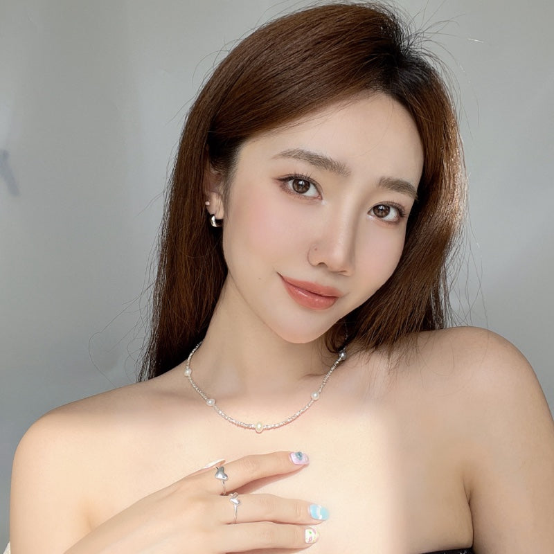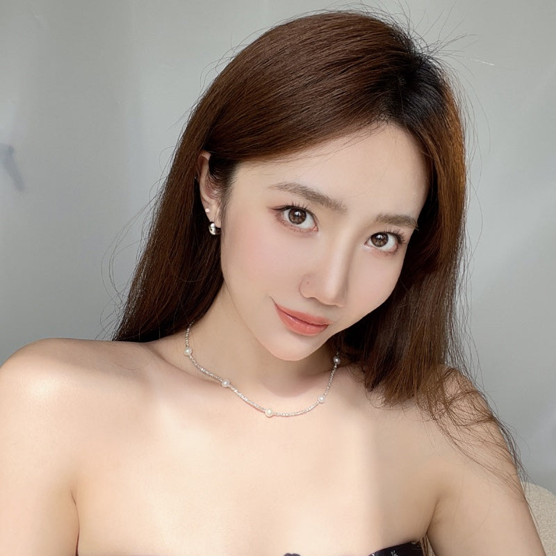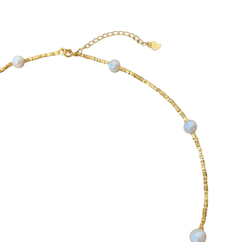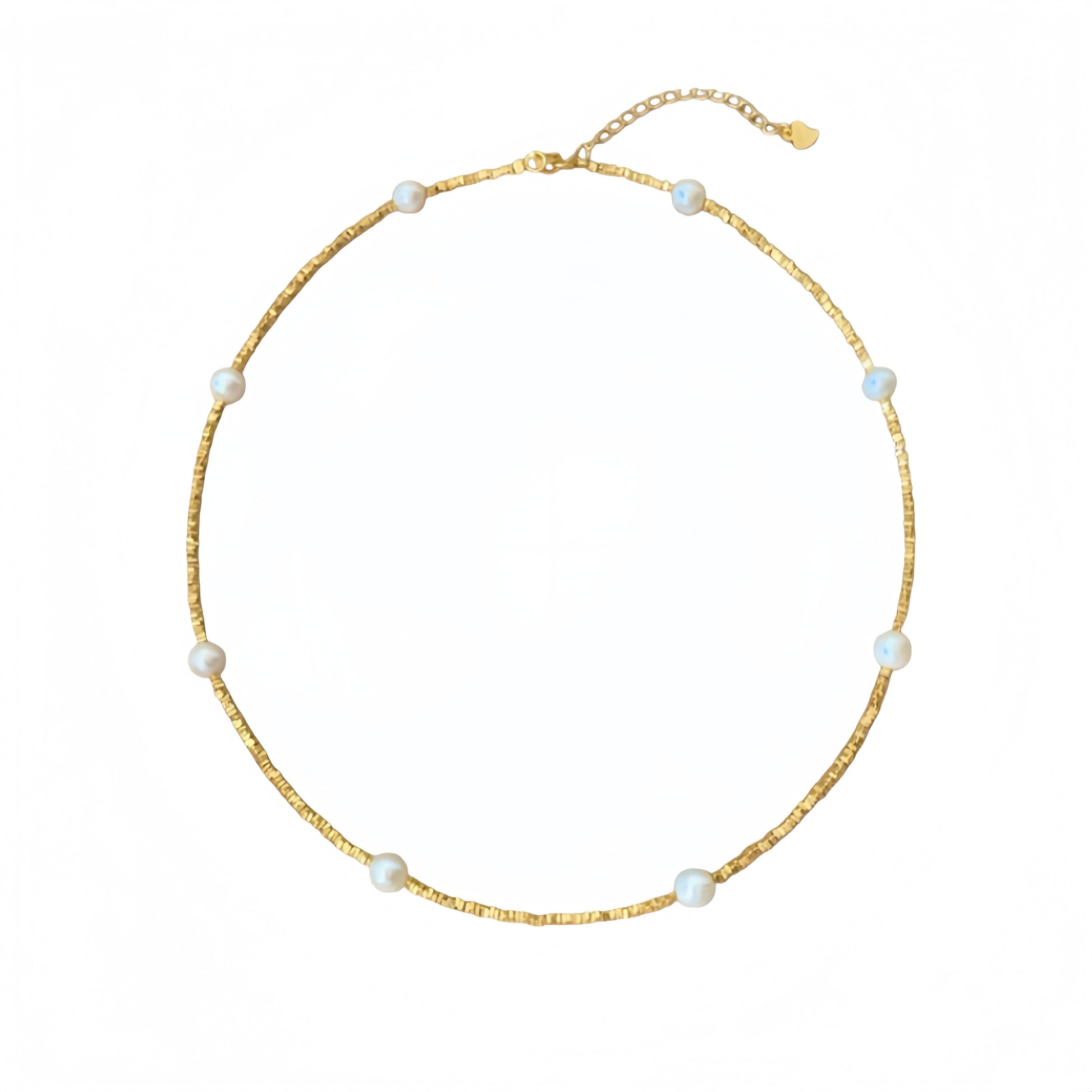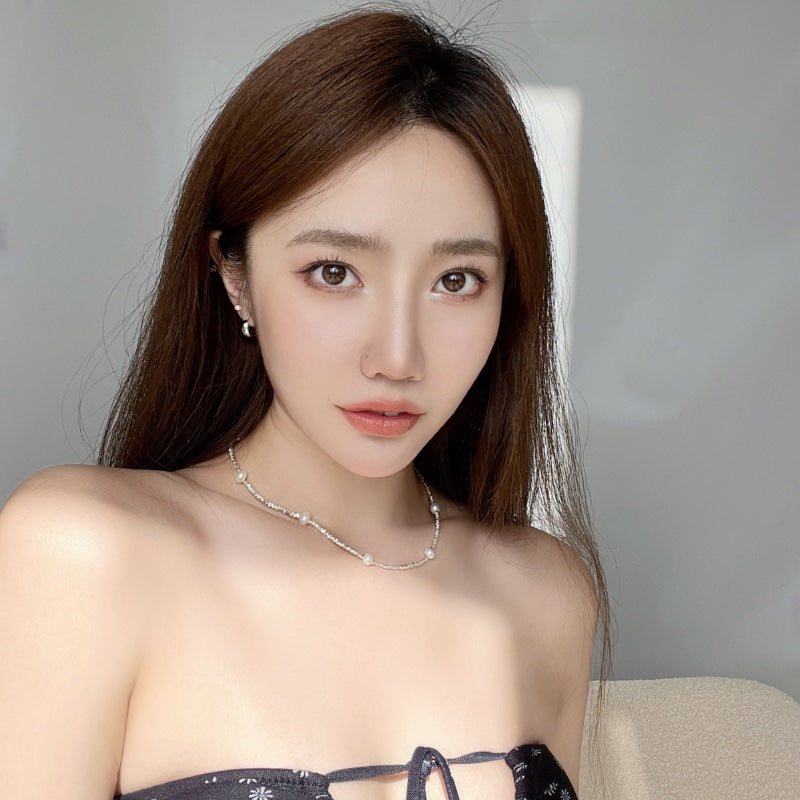 ゴージュアスなチェーンに散りばめられた真珠が、シンプルでありながらエレガントなデザインを生み出す。メッキの艶やかな輝きが、真珠の清らかさを引き立て、首元に存在感とともに、洗練された雰囲気を添える。角度によって変化する真珠の光沢が、日常の装いにもスタイリッシュなアクセントを加え、優雅な印象を演出する。
