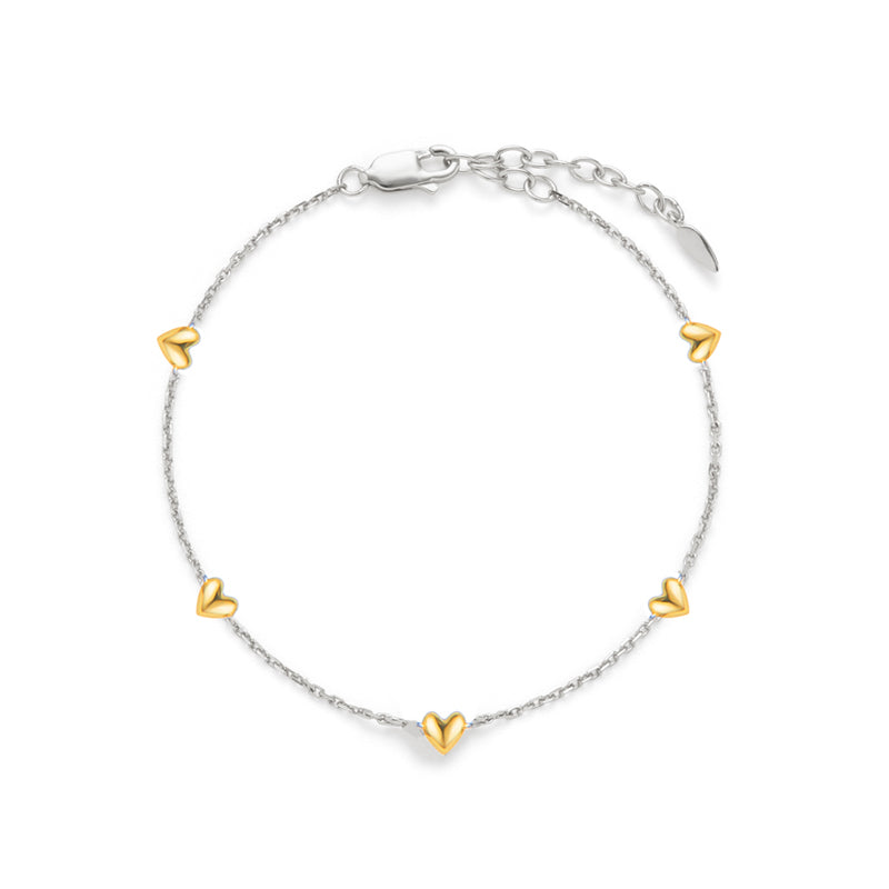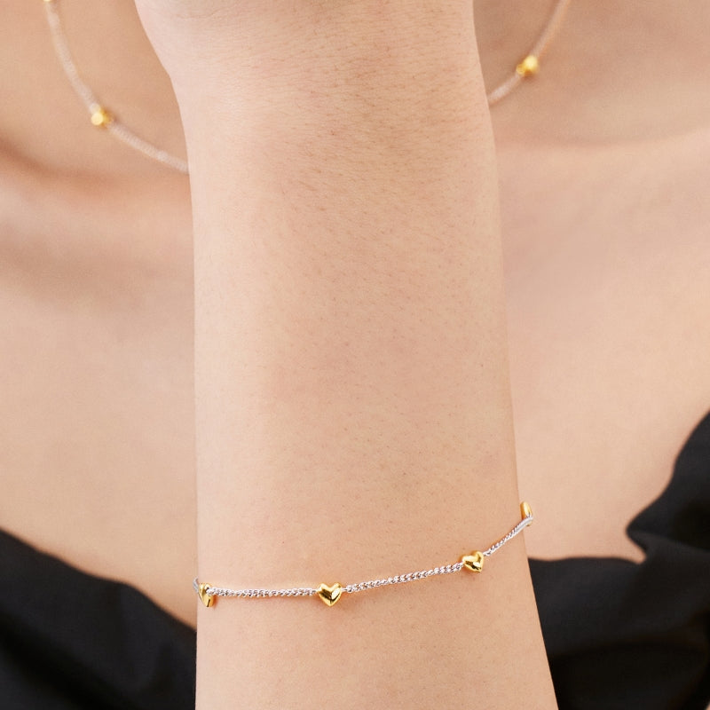 小さなハートモチーフが連なり、繊細な立体デザインを紡ぐ。力強い金属質感と可憐なデザインが融合し、角度によって異なる光沢が入れ替わり、手元に存在感とエレガントな輝きを添える。どの瞬間も印象的な演出を魅せる。