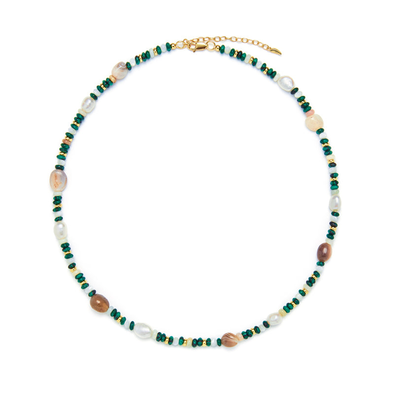 多彩な天然石とビーズが連なり、リズミカルでアート感あふれるデザインを生み出す。メッキの輝きが、天然石の個性的な色合いを引き立て、首元に独特な存在感と洗練された輝きを添える。角度によって変化する光沢が、様々なシーンで印象的な演出を叶え、「印象串珠(インプレッションビーズ)」のような、アートな雰囲気を演出する。