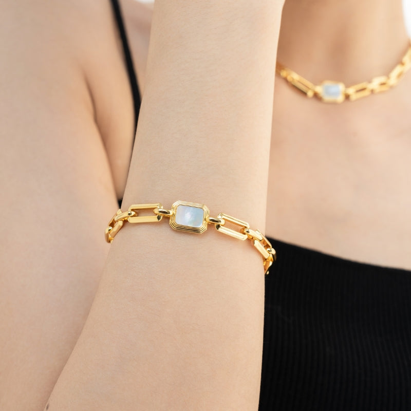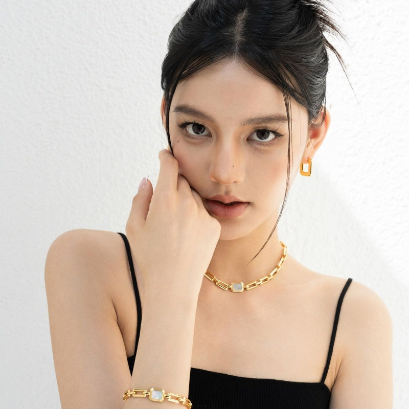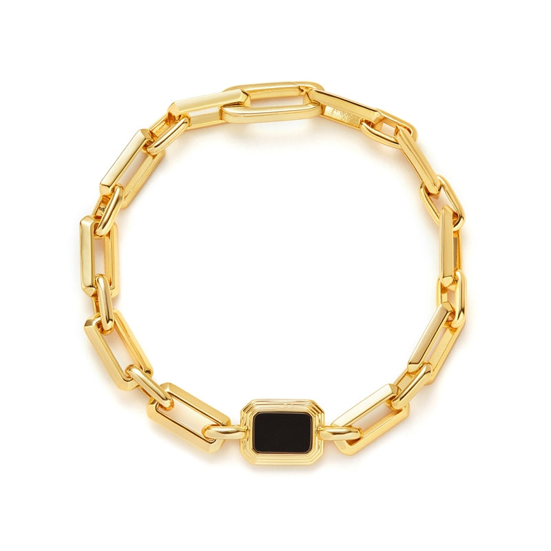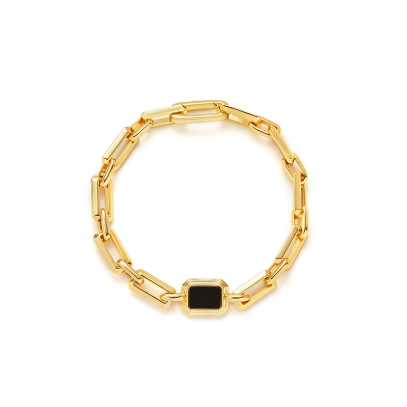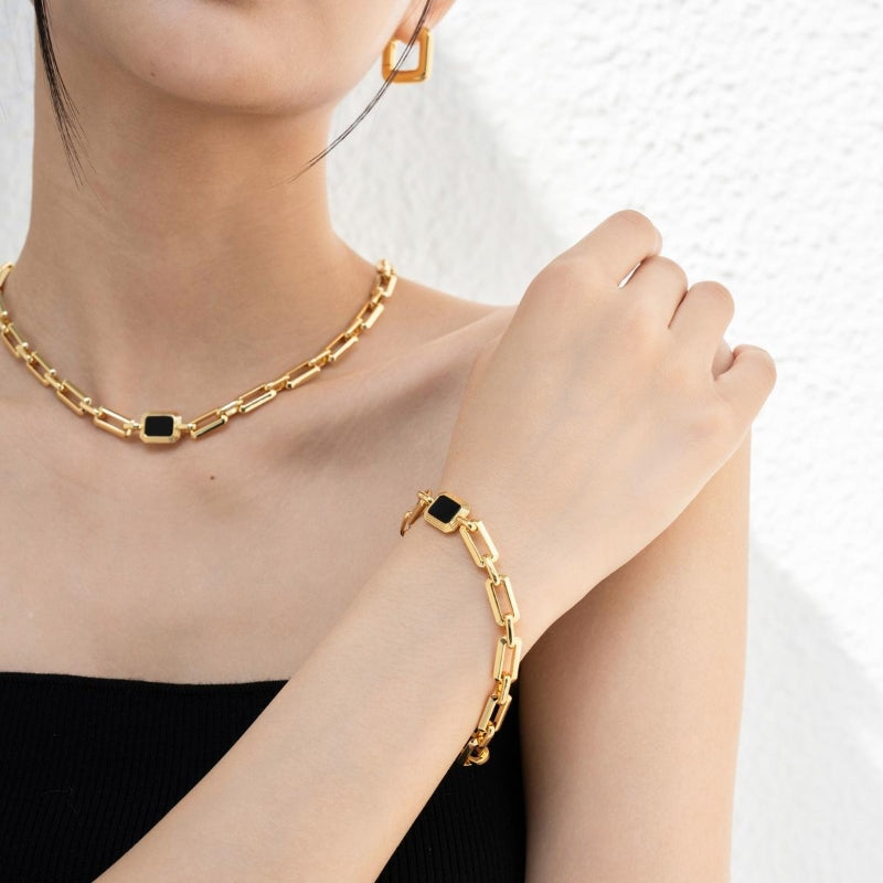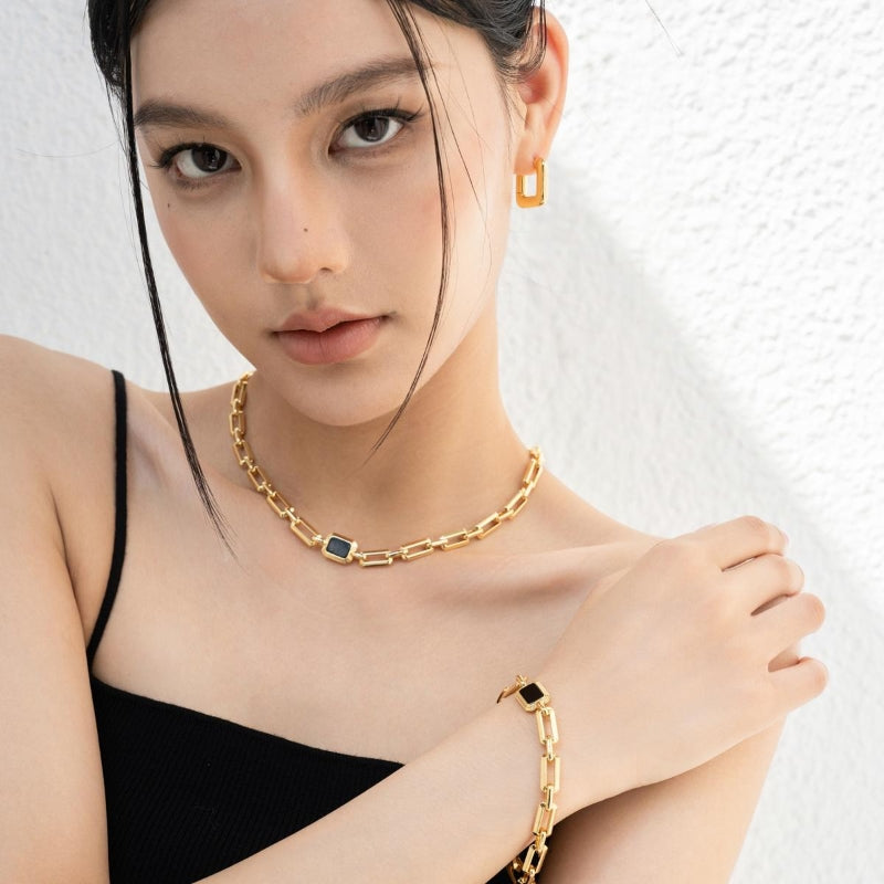 太めのリンクチェーンと幾何学的な黒パーツが融合したデザイン。ゴールドの艶やかさと黒パーツの深みが相まって、力強さとエレガンスを併せ持つ存在感を演出。角度によって異なる光沢を放ち、どの瞬間も印象的な輝きを叶える。