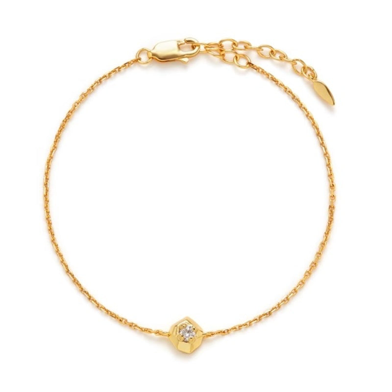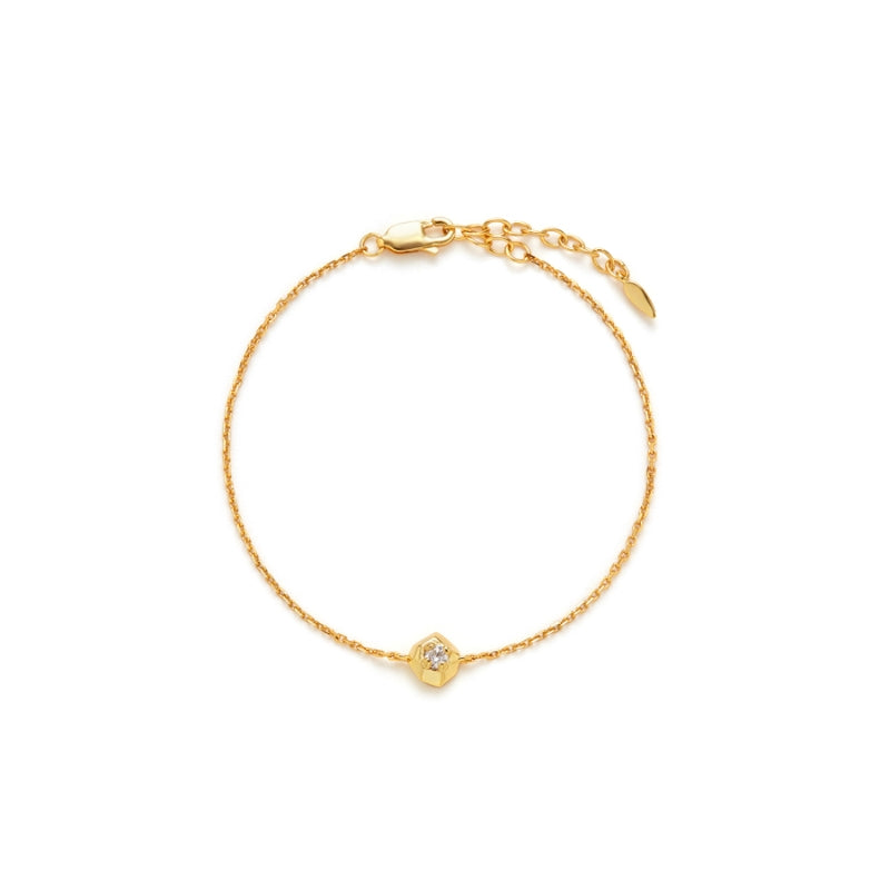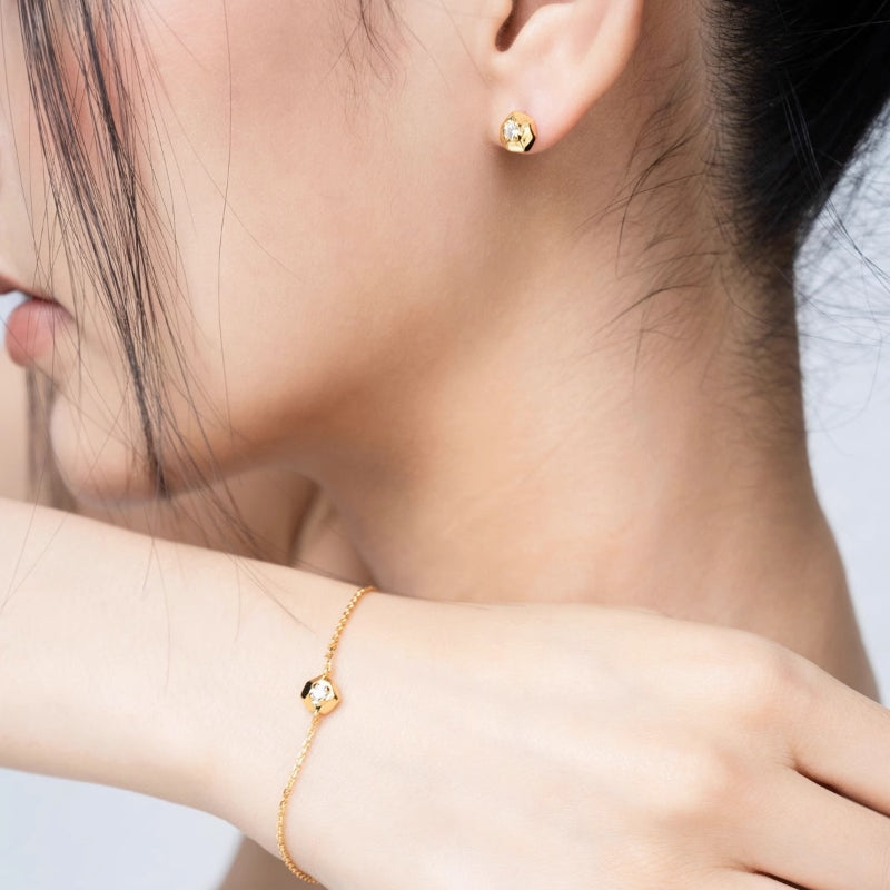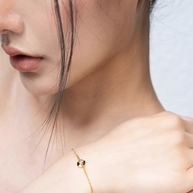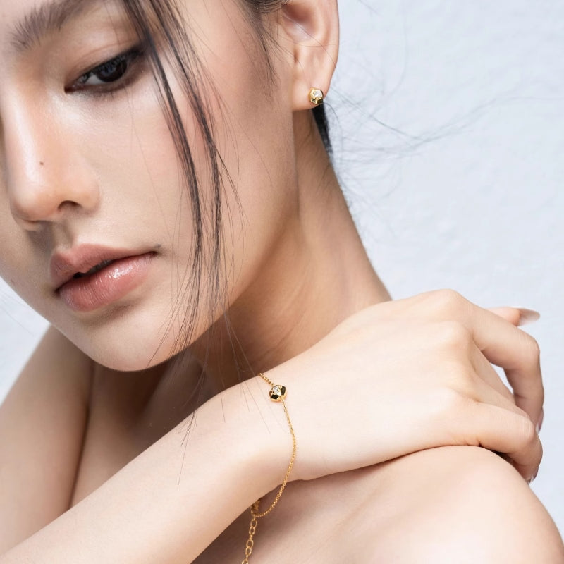 シンプルなチェーンに幾何学的なペンダントが配され、滑らかな曲線と輝く装飾が立体的なデザインを織りなす。力強さとエレガンスを併せ持ち、手首に存在感と洗練された輝きを添える。角度によって異なる光沢を放ち、どの瞬間も印象的に演出します。