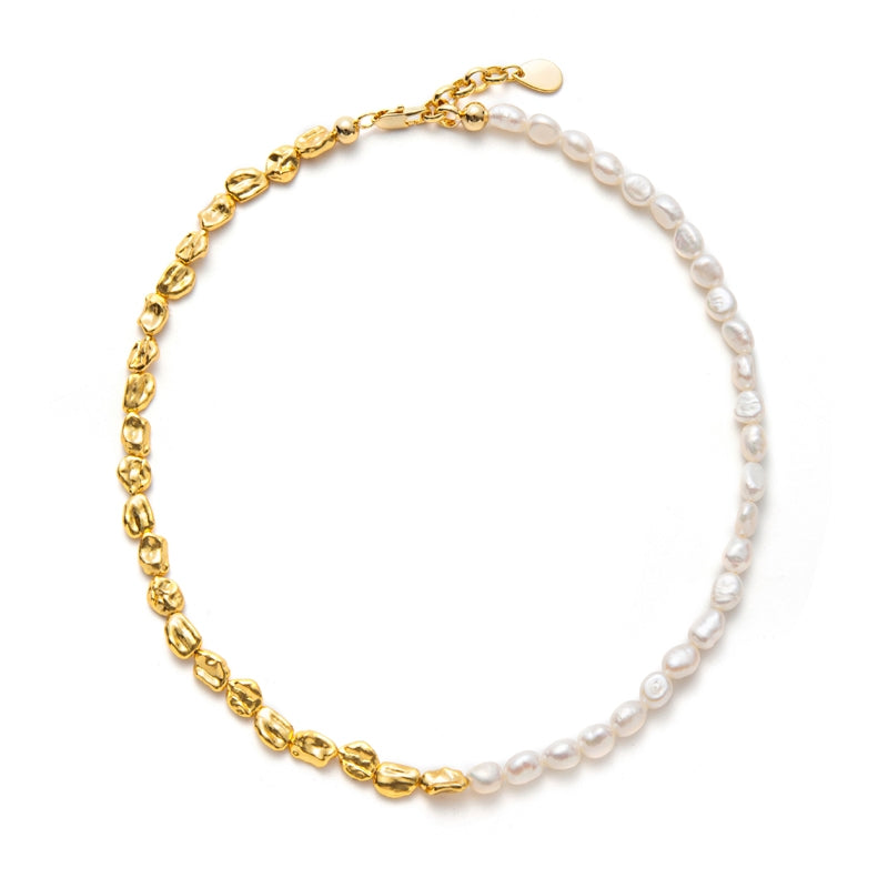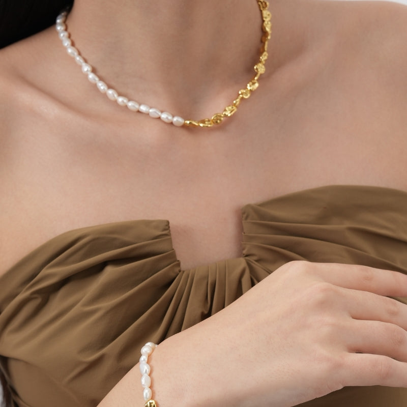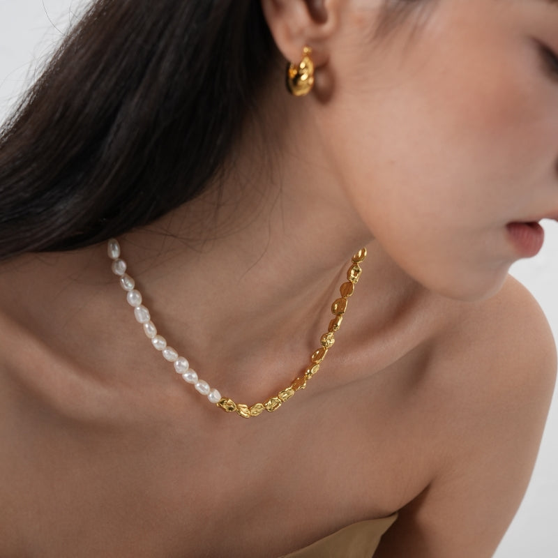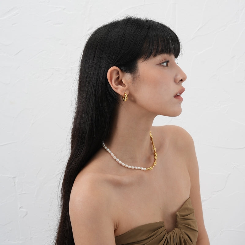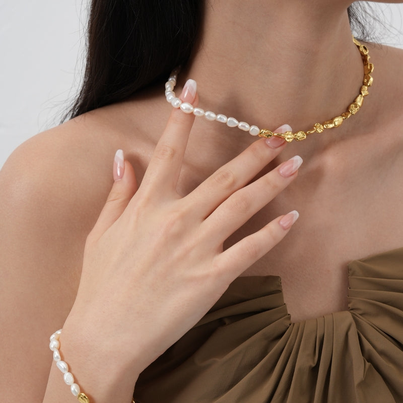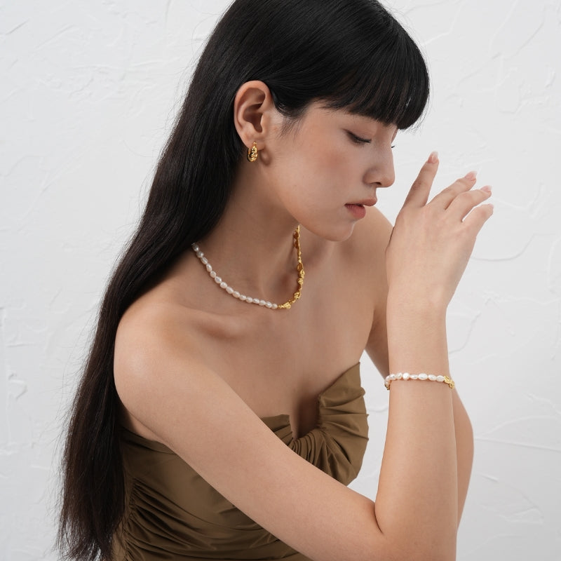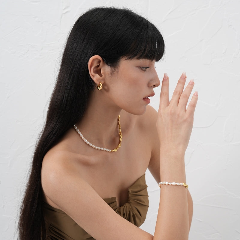 真珠とメッキチェーンが融合した滑らかな曲線のデザイン。力強さと個性的なエレガンスを併せ持ち、バロック調の輝きが存在感を放つ。角度によって真珠の独特な光沢とメッキの輝きが変化し、印象的な演出となる。