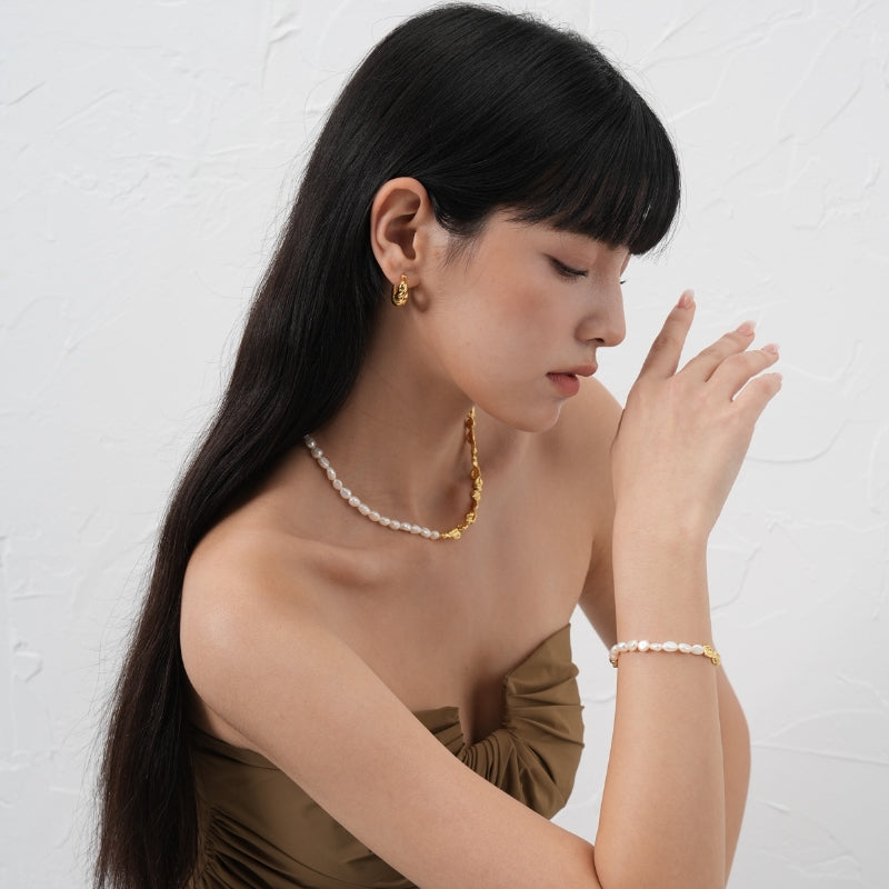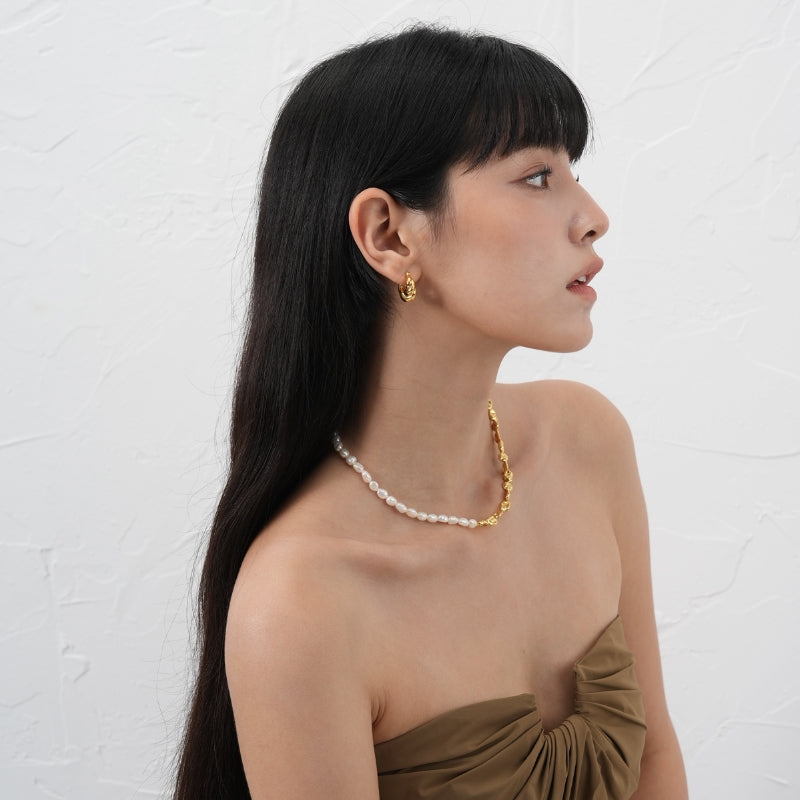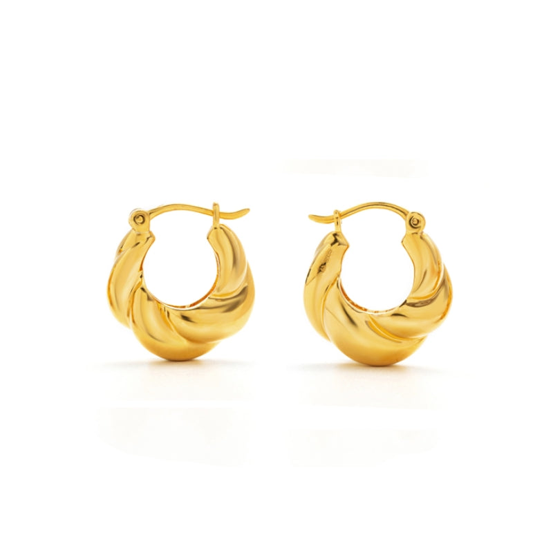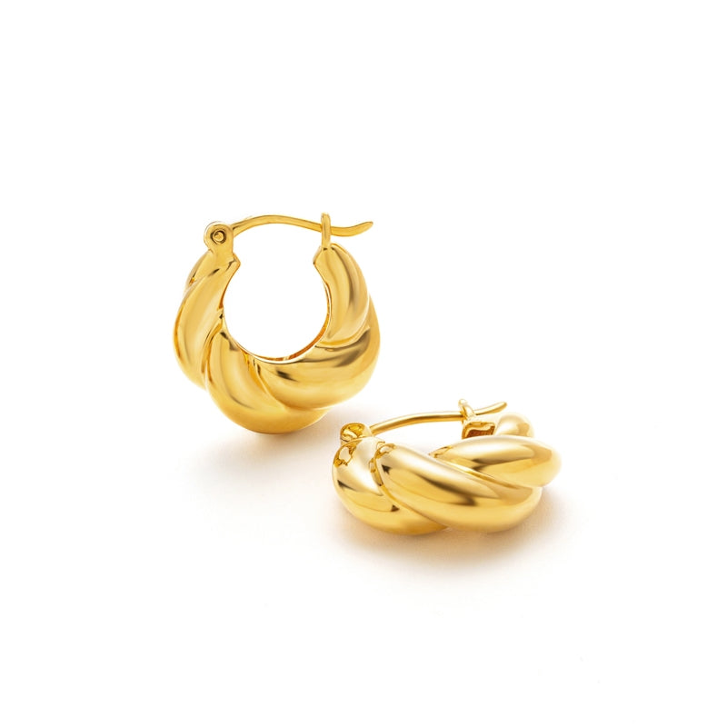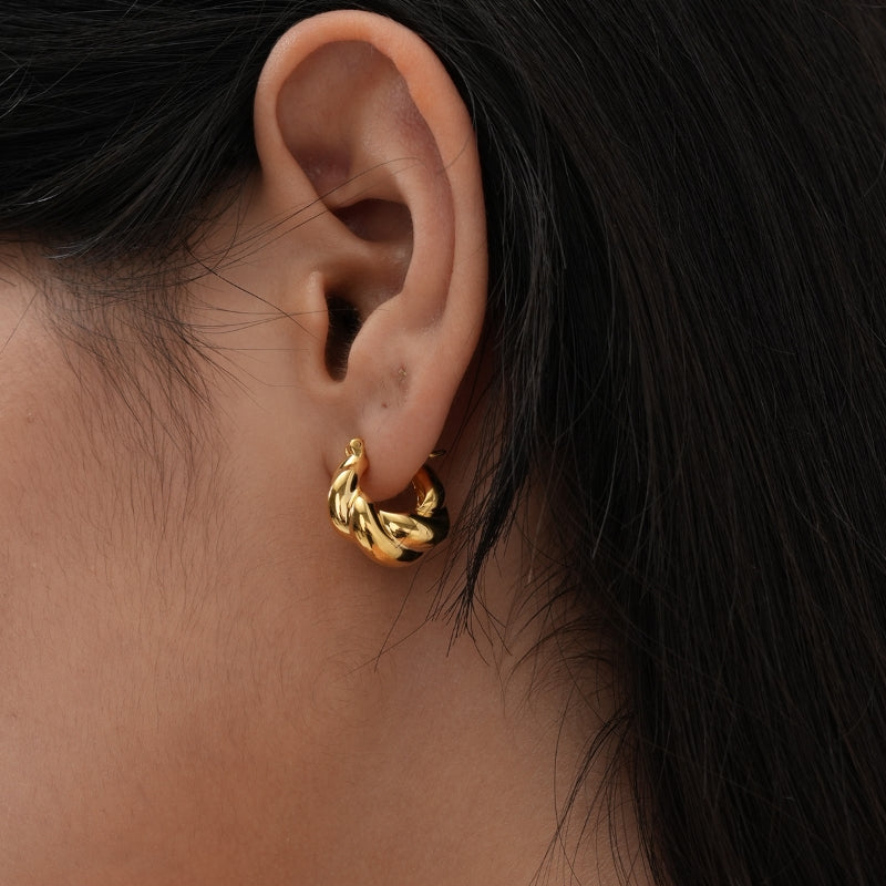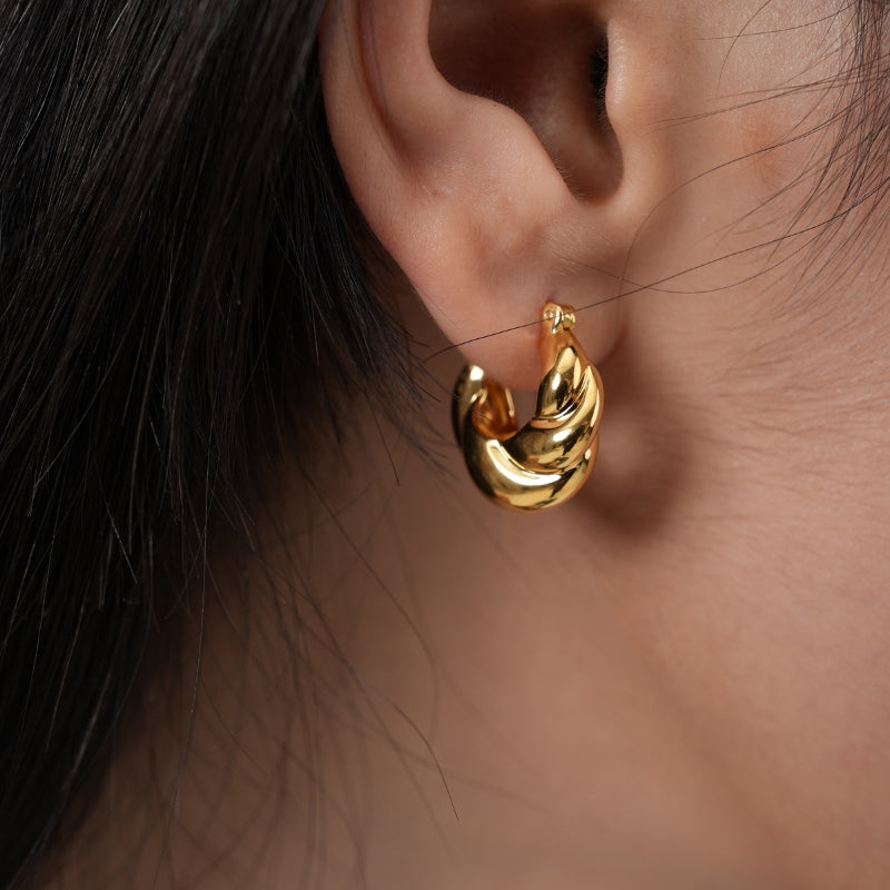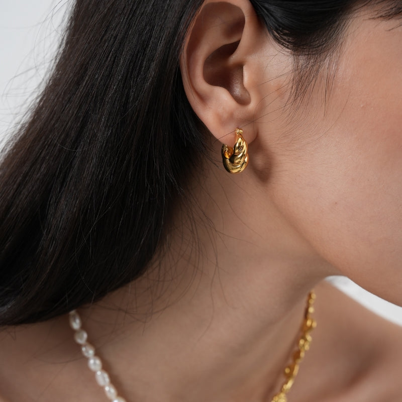重なり合う流れるような曲線が織りなす立体的なデザイン。力強さと巴洛克服飾らしいエレガンスを併せ持つフォルムが、耳元に存在感と洗練された輝きを添えます。角度によって異なる光沢を放ち、どの瞬間も印象的に演出します。