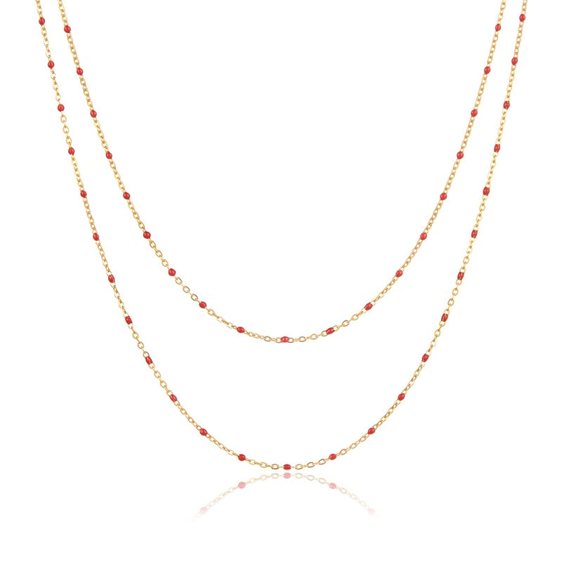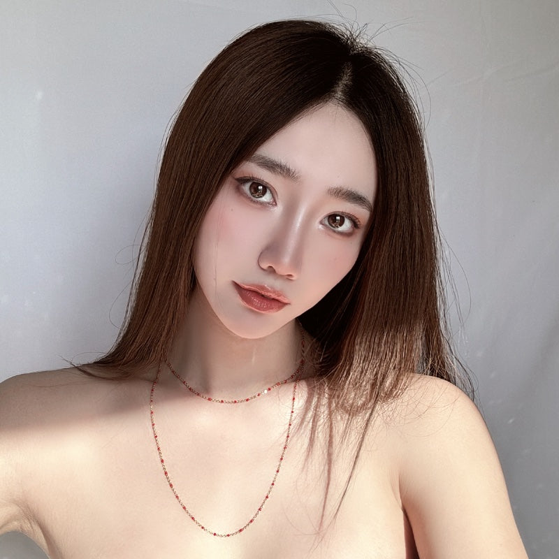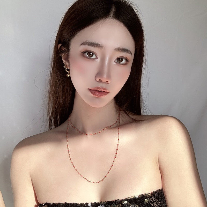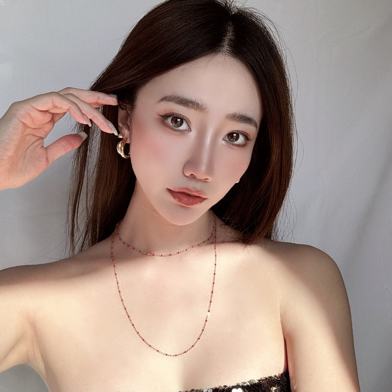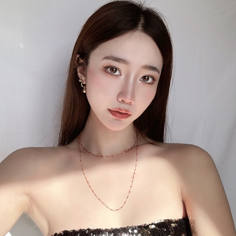 シンプルなチェーンにレッドビーズが点在し、軽やかでありながら印象的なデザイン。メッキの輝きが、レッドビーズの鮮やかな色合いを引き立て、首元に存在感と洗練された雰囲気を添える。角度によって変化する光沢が、爽やかな演出を叶える。