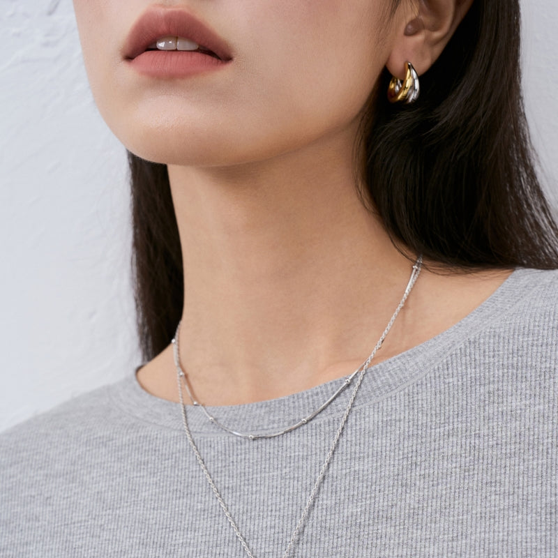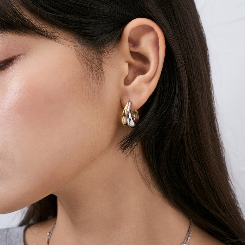 重なり合う滑らかな曲線が織りなす立体的なデザイン。力強さとエレガンスを併せ持つフォルムが、顔まわりに存在感と洗練された輝きを添えます。角度によって異なる光沢を放ち、どの瞬間も印象的に演出します。