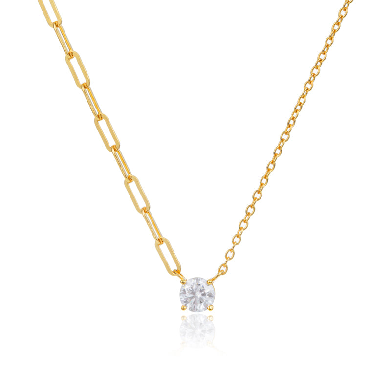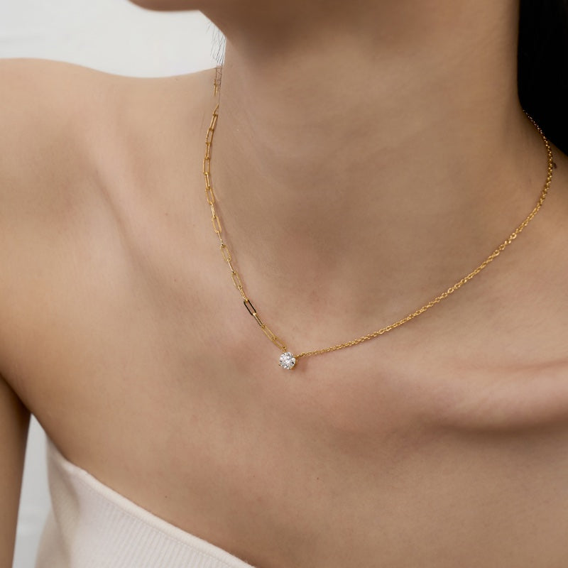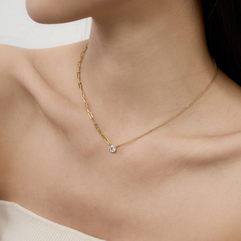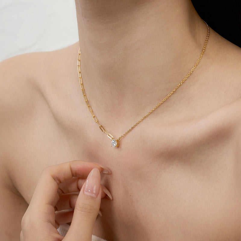 リンクチェーンとファインチェーンが融合し、シンプルでありながら洗練されたデザインを生み出す。メッキの艶やかな輝きが、ジルコニアの輝きを引き立て、首元に存在感とともに、エレガントな雰囲気を添える。角度によって変化する光沢が、日常の装いにもスタイリッシュなアクセントを加え、「璀璨星河(きらめく星河)」シリーズのような、煌びやかな印象を演出する。