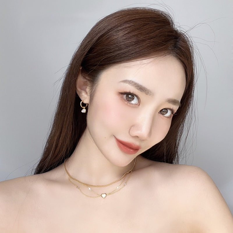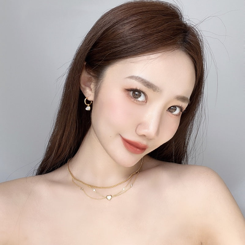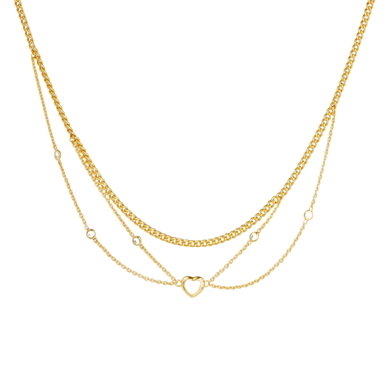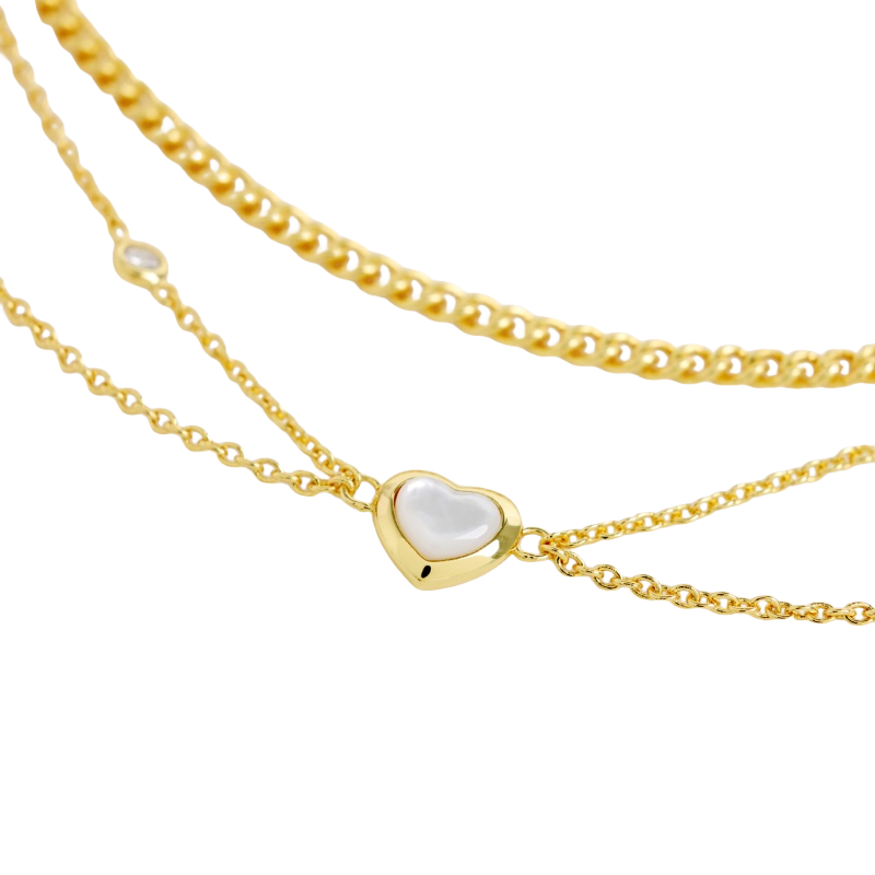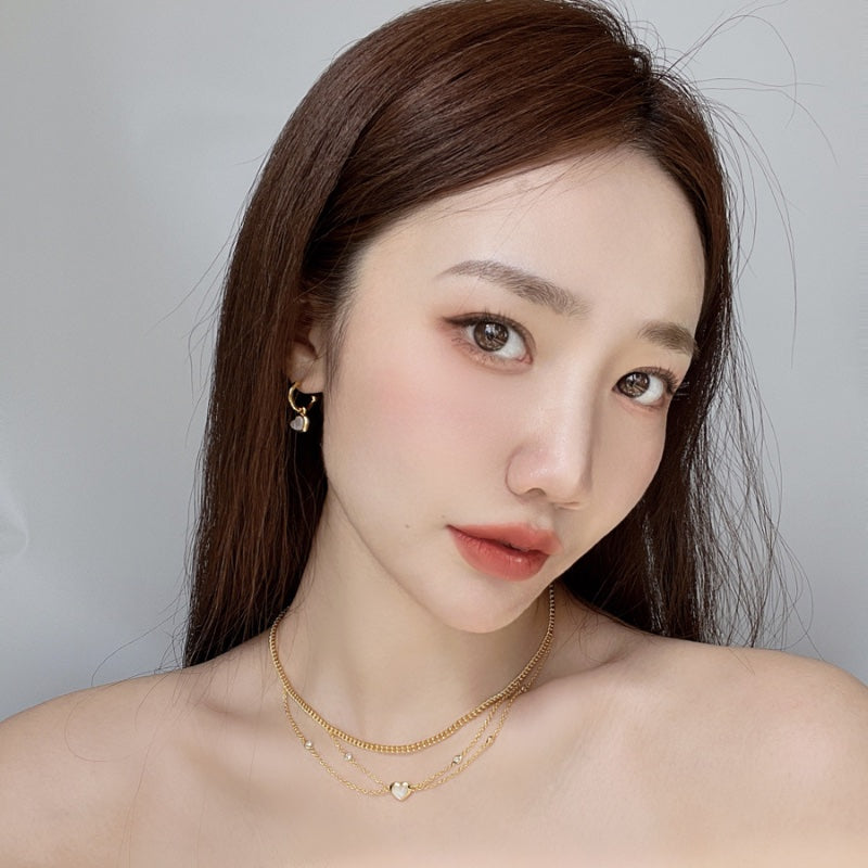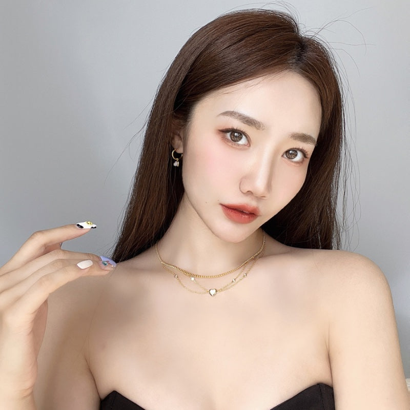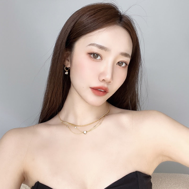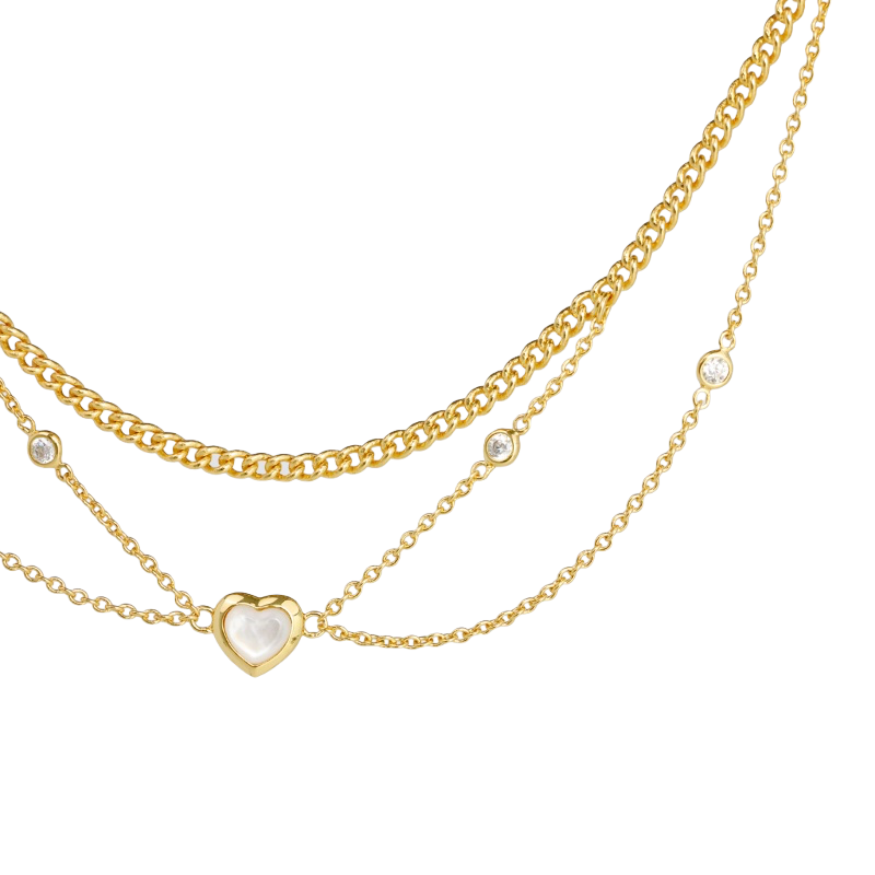 多層のチェーンが重なり、ハート型の白ベムーアペンダントが輝き、レトロでありながらエレガントなデザインを生み出す。力強さとエレガンスを併せ持つフォルムが、首元に存在感と洗練された輝きを添え、角度によって変化する光沢が、優雅な雰囲気を演出し、どの瞬間も印象的に輝かせます。