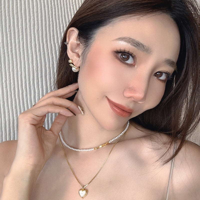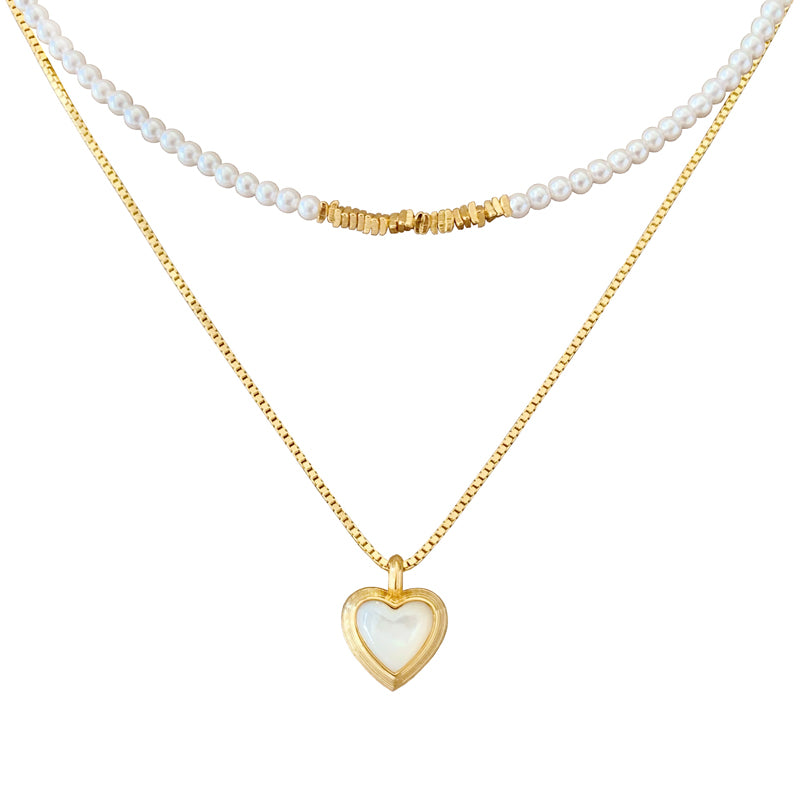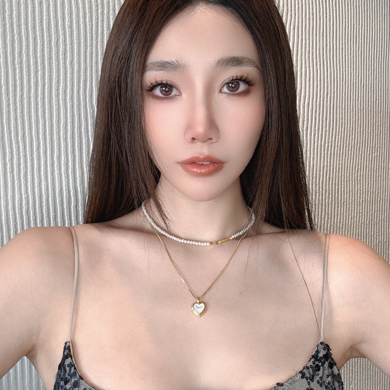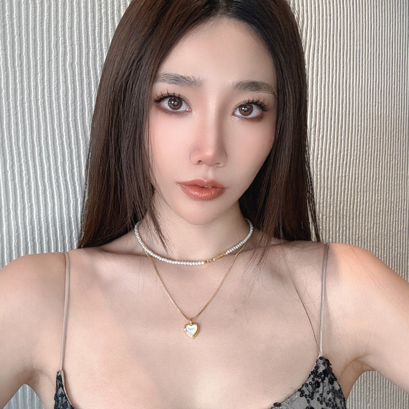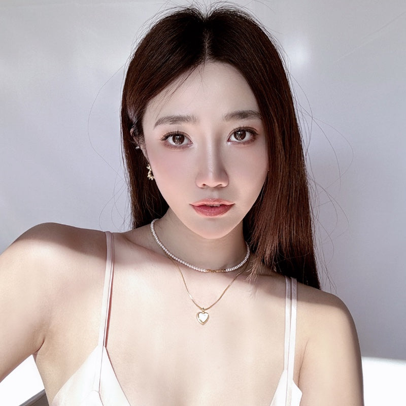 ベビーパールのチェーンとシンプルなメタルチェーンが重なり、ハートペンダントの白ベムーアが輝き、レトロでありながらエレガントなデザインを生み出す。力強さとエレガンスを併せ持つフォルムが、首元に存在感と洗練された輝きを添え、角度によって変化する光沢が、優雅な雰囲気を演出し、どの瞬間も印象的に輝かせます。
