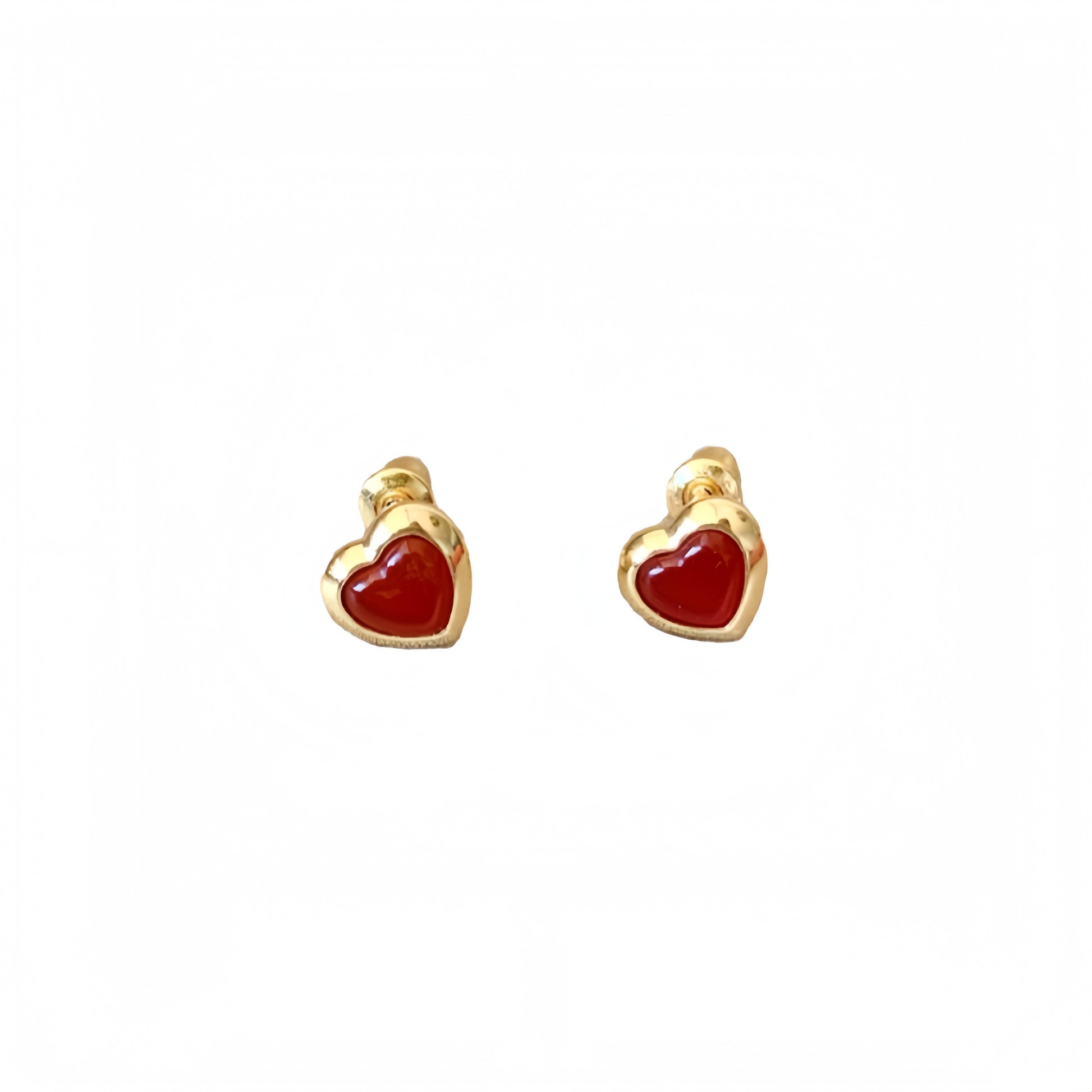 ハート型の天然紅瑪瑙が、メッキの金色のフレームに包まれ、力強さとエレガンスを併せ持つデザインとなっている。瑪瑙の鮮やかな赤色とメッキの輝きが、耳元に存在感と洗練された輝きを添える。角度によって変化する光沢が、様々なシーンで印象的な演出を叶える。