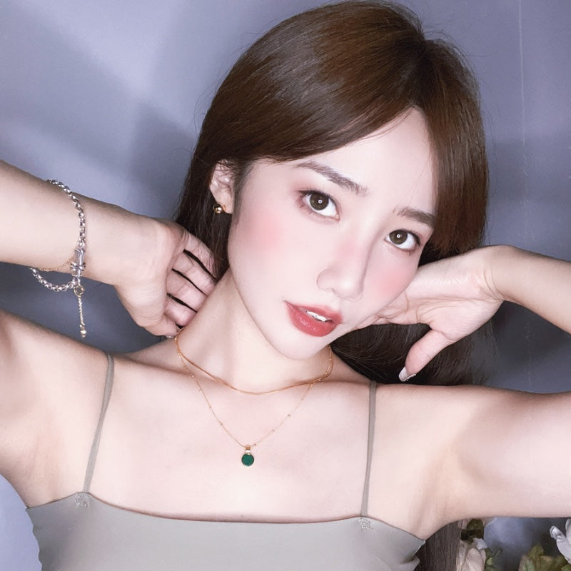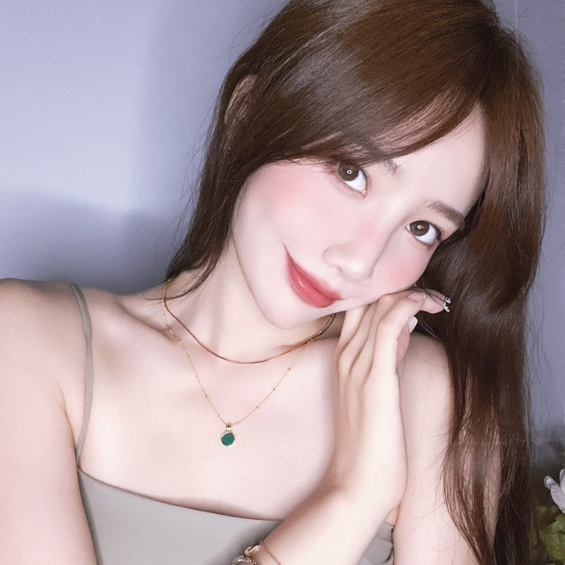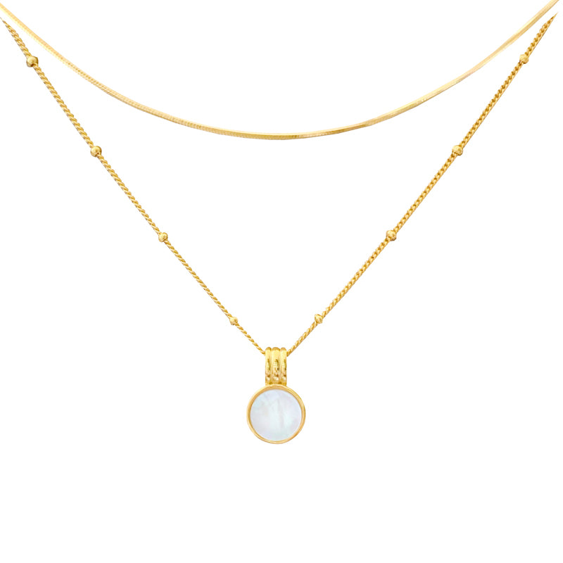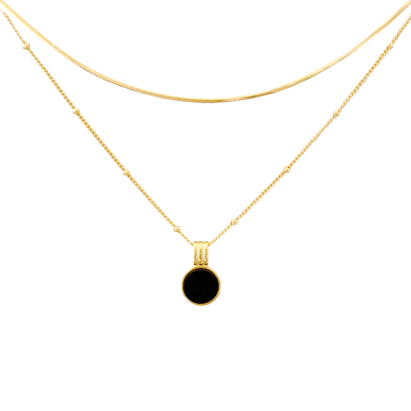多層のチェーンが重なり、シックでありながら個性的なデザインを生み出す。メッキの艶やかな輝きが、天然石の深みのある色彩を引き立て、首元に力強さとエレガンスを兼ね備えた存在感を与える。角度によって変化するチェーンとペンダントの光沢が、装いにスタイリッシュで印象的なアクセントを加え、ヴィンテージな雰囲気を演出する。