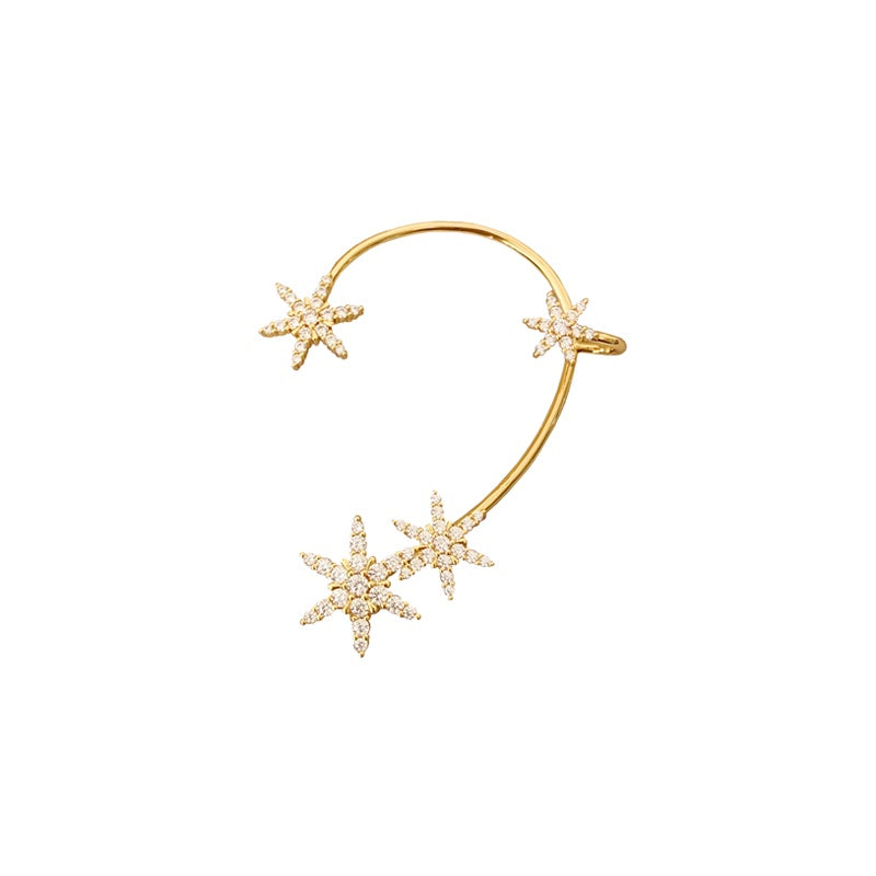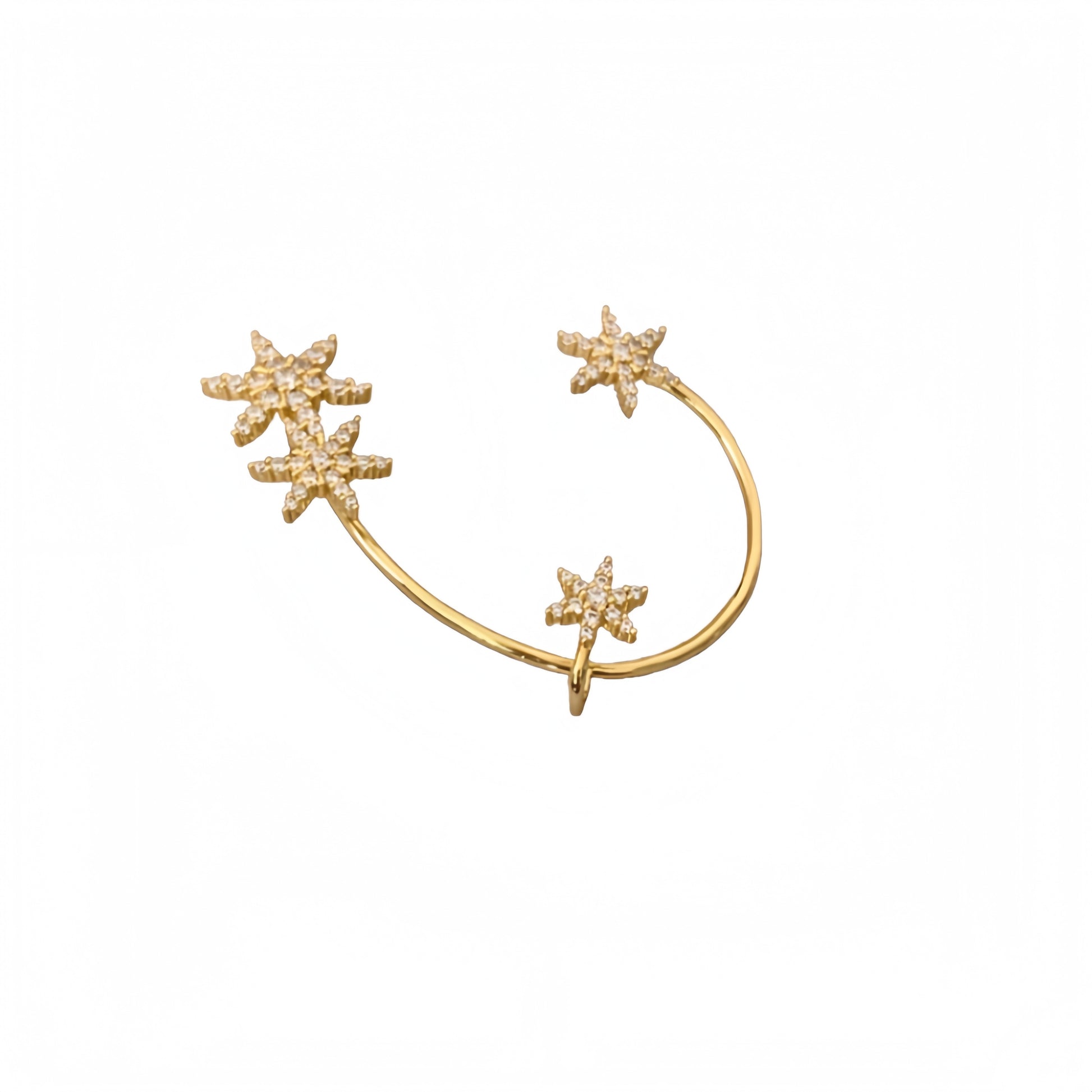 星型モチーフが輝き、アーチ型のフォルムと融合して、シックでありながらドラマティックなデザインを生み出す。メッキの艶やかな輝きが、ストーンの煌びやかさを引き立て、耳元に存在感とともに、エレガントな雰囲気を添える。角度によって変化する光沢が、日常の装いにもスタイリッシュなアクセントを加え、「星屑(ほしくず)」のような、幻想的な印象を演出する。